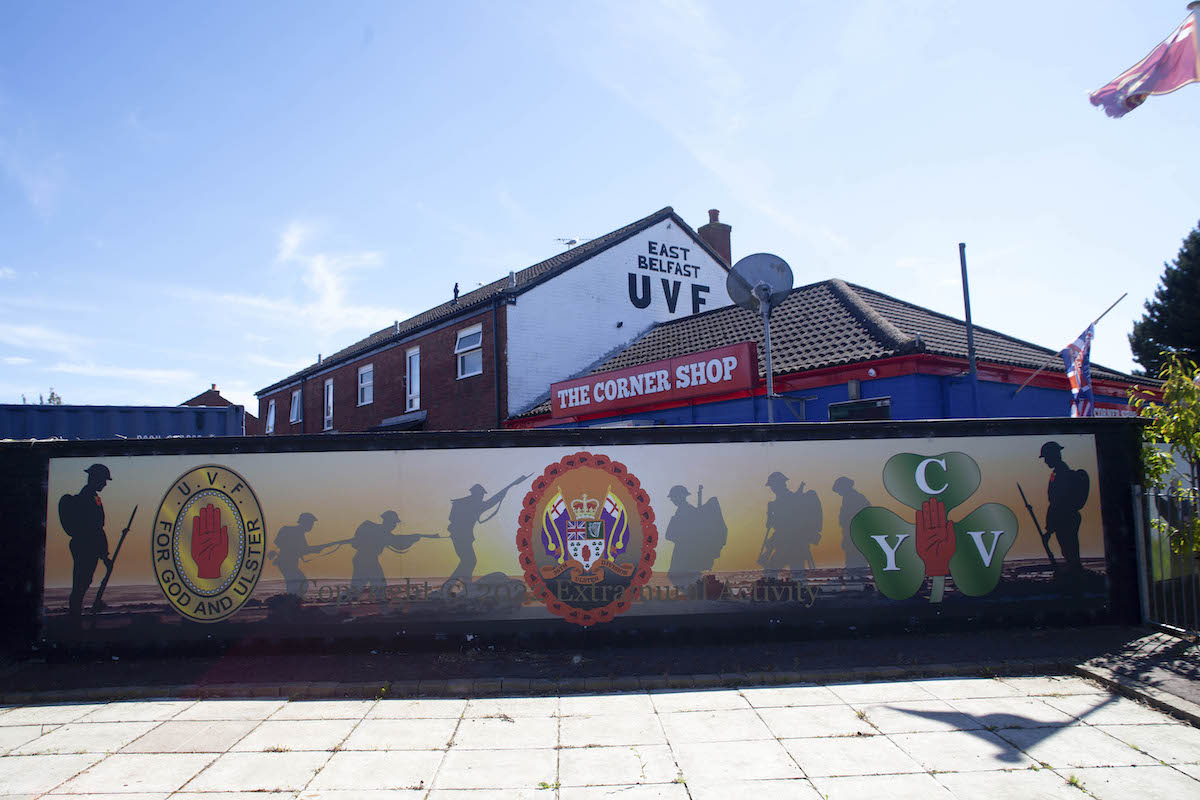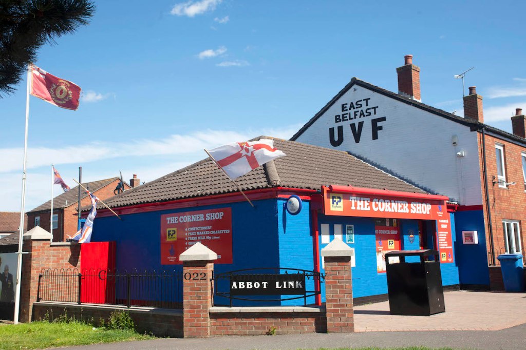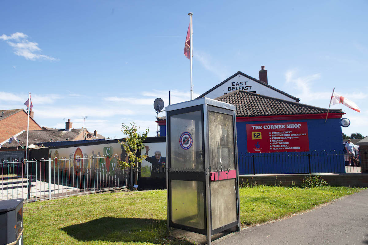 Three-in-a-row at the Bowtown (Newtownards) newsagents: on the left, “Lest we forget” (final image); in the middle, the emblems of the UVF, 36th Division, and YCV against a backdrop of WWI soldiers; on the right-hand, Captain Tom Moore, who raised money for the NHS during lockdown. Above the shop itself can be seen “East Belfast UVF” while the flag is from the North Down UVF. The sticker on the phone box says Stop PSNI Harassment.