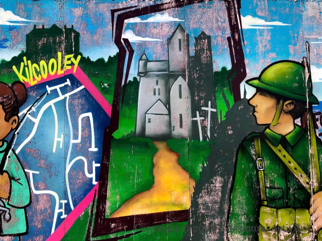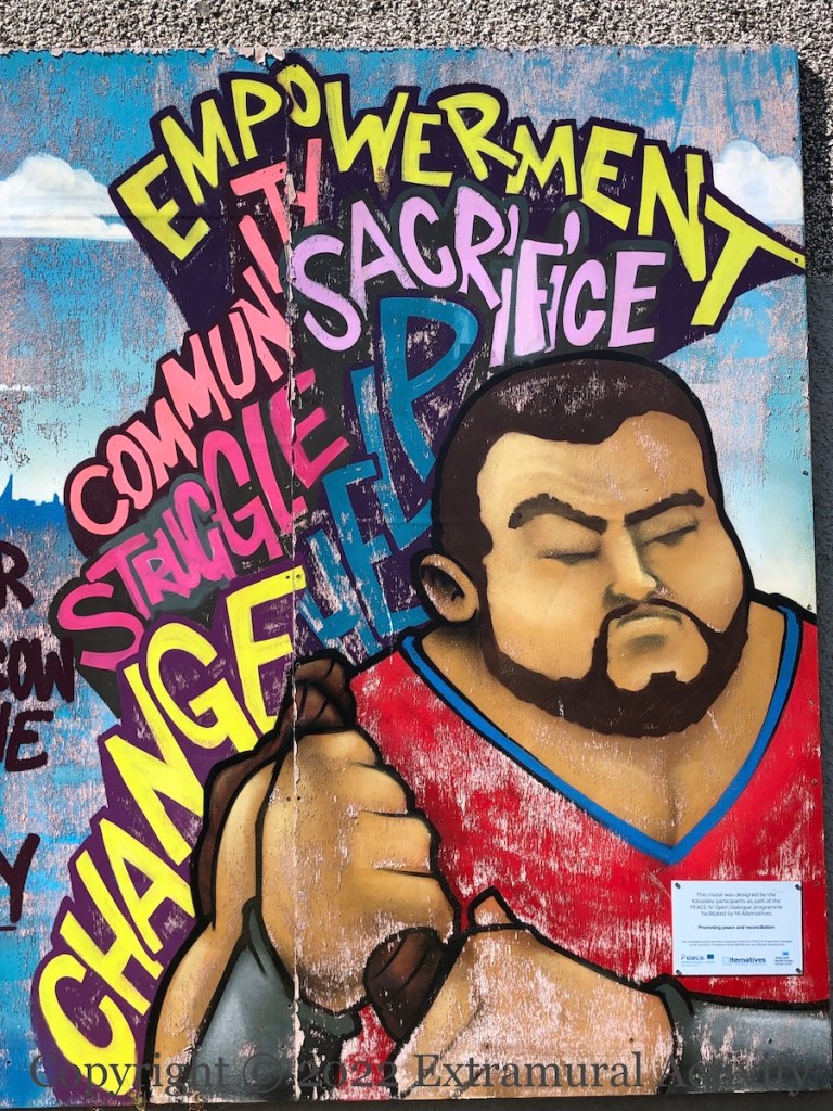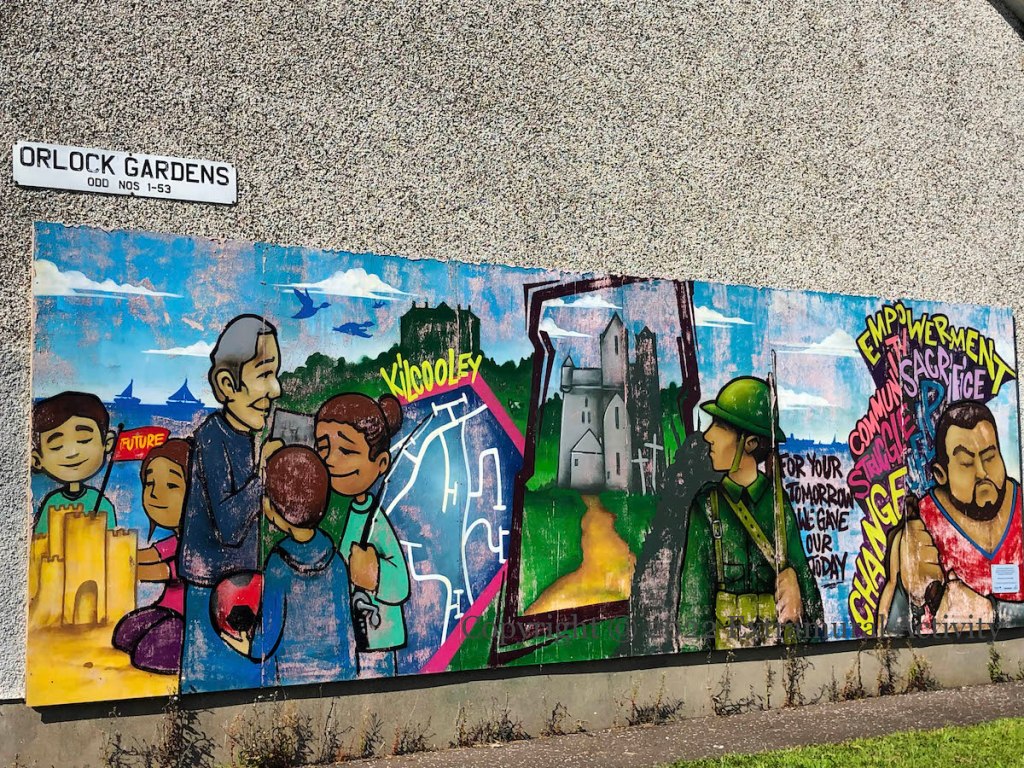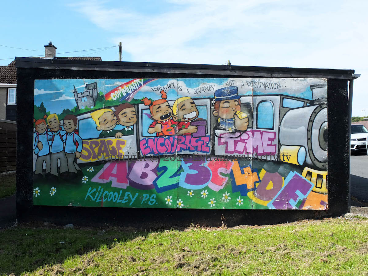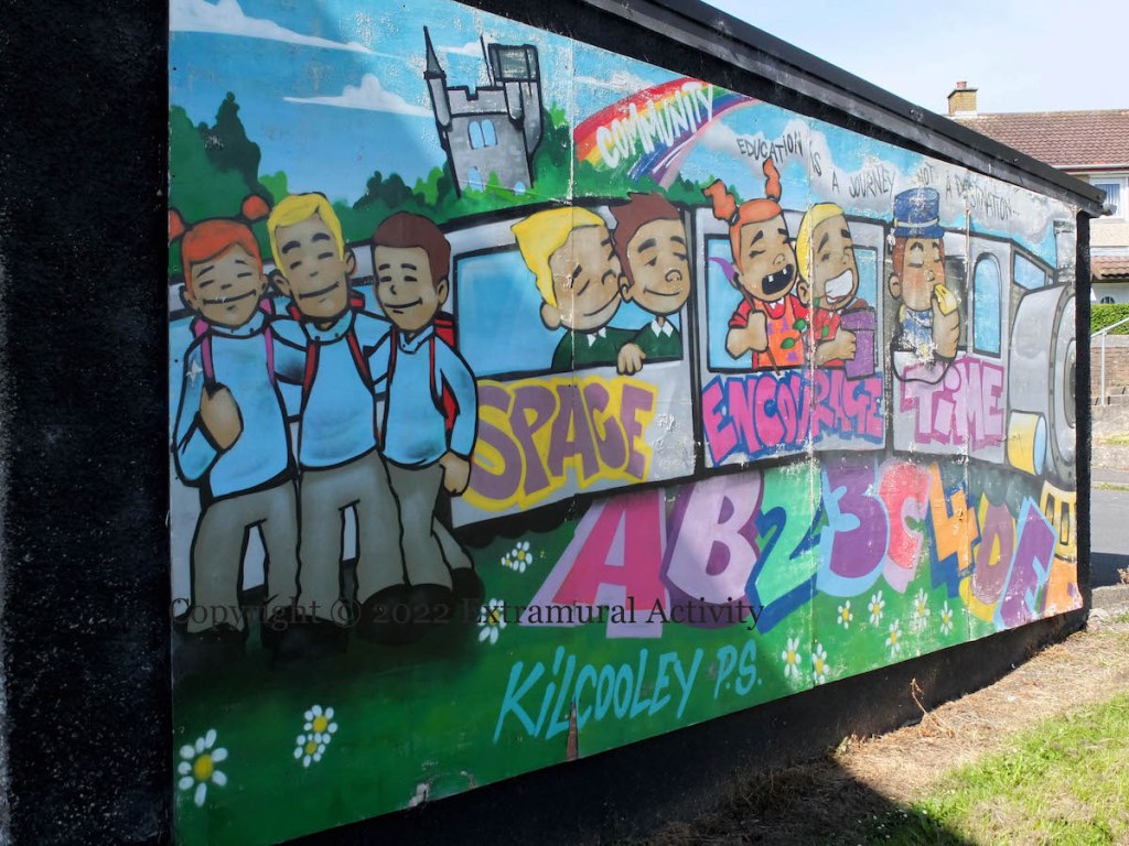 Here are two murals aimed at children in Kilcooley, Bangor. On the one hand, the first one (images 1, 2, 3) includes a WWI soldier and the saying “For your tomorrow, we gave our today”; on the other, the second – Education is a journey, not a destination – is a NIHE project that replaces a UDA mural: see Simply The Best.