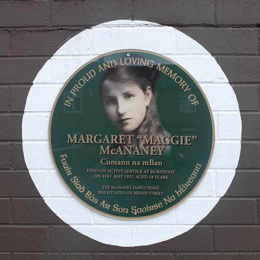 “In proud and loving memory of Margaret “Maggie” McAnaney, Cumann na mBan, died on active service at Burnfoot on 31st May 1922, aged 18 years. The McAnaney family home was situated on Bishop Street. Fuaır sıad bás ar son saoırse na hÉıreann.”