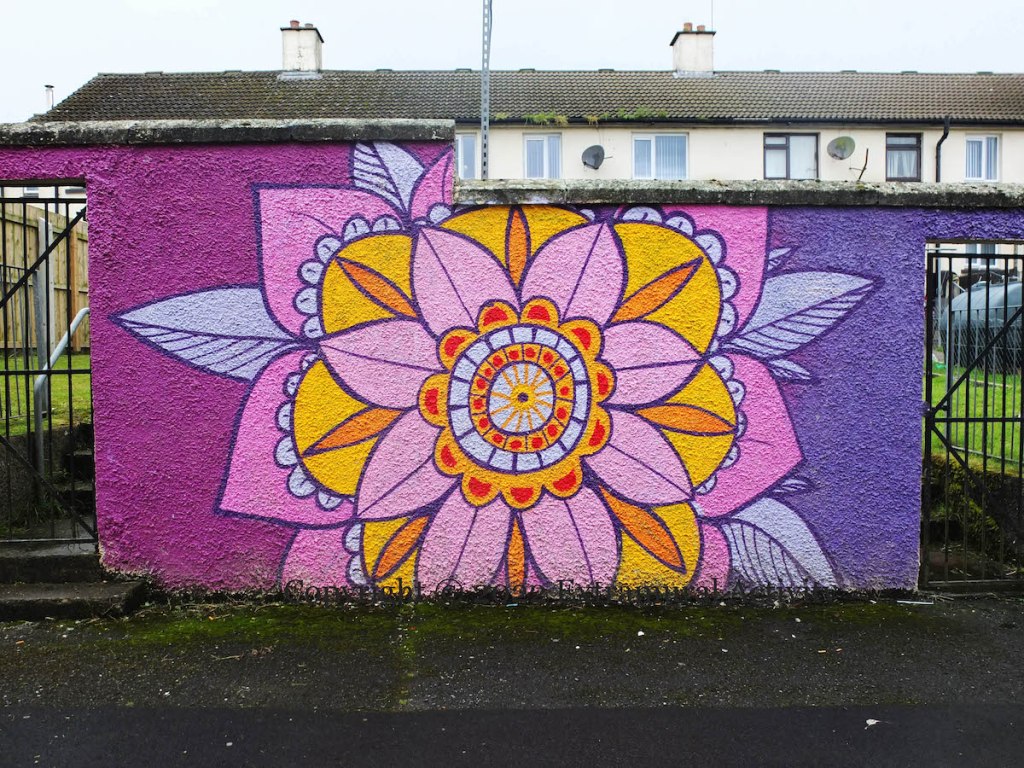 These flowery designs are in the alley leading from Central Drive to Rinmore Drive, where you can see the “RYAD” graffiti, which is presumably a variation on RAAD (see previously External & Internal) meaning “Republican Youth Against Drugs”.
