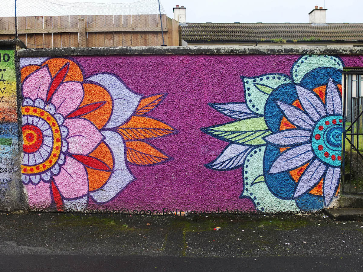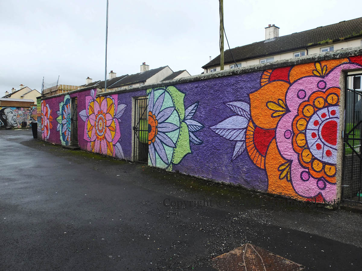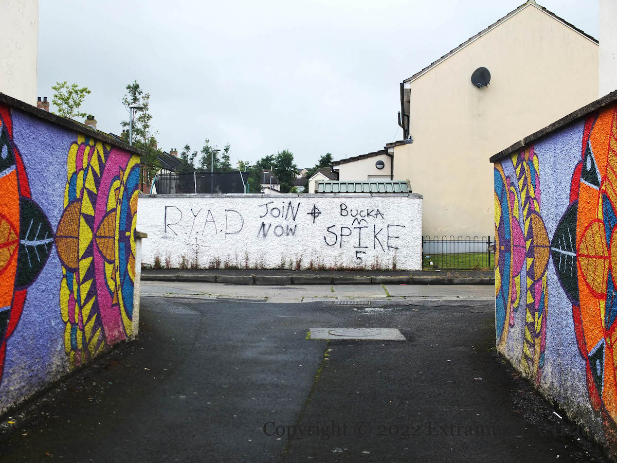 These flowery designs are in the alley leading from Central Drive to Rinmore Drive, where you can see the “RYAD” graffiti, which is presumably a variation on RAAD (see previously External & Internal) meaning “Republican Youth Against Drugs”.