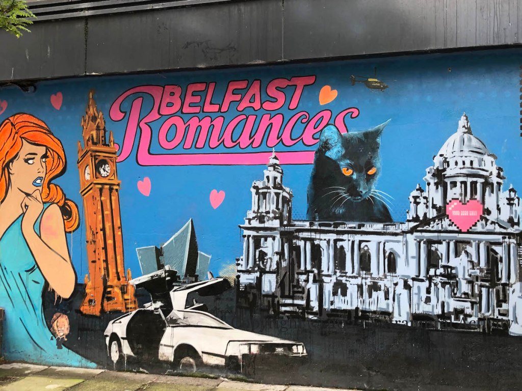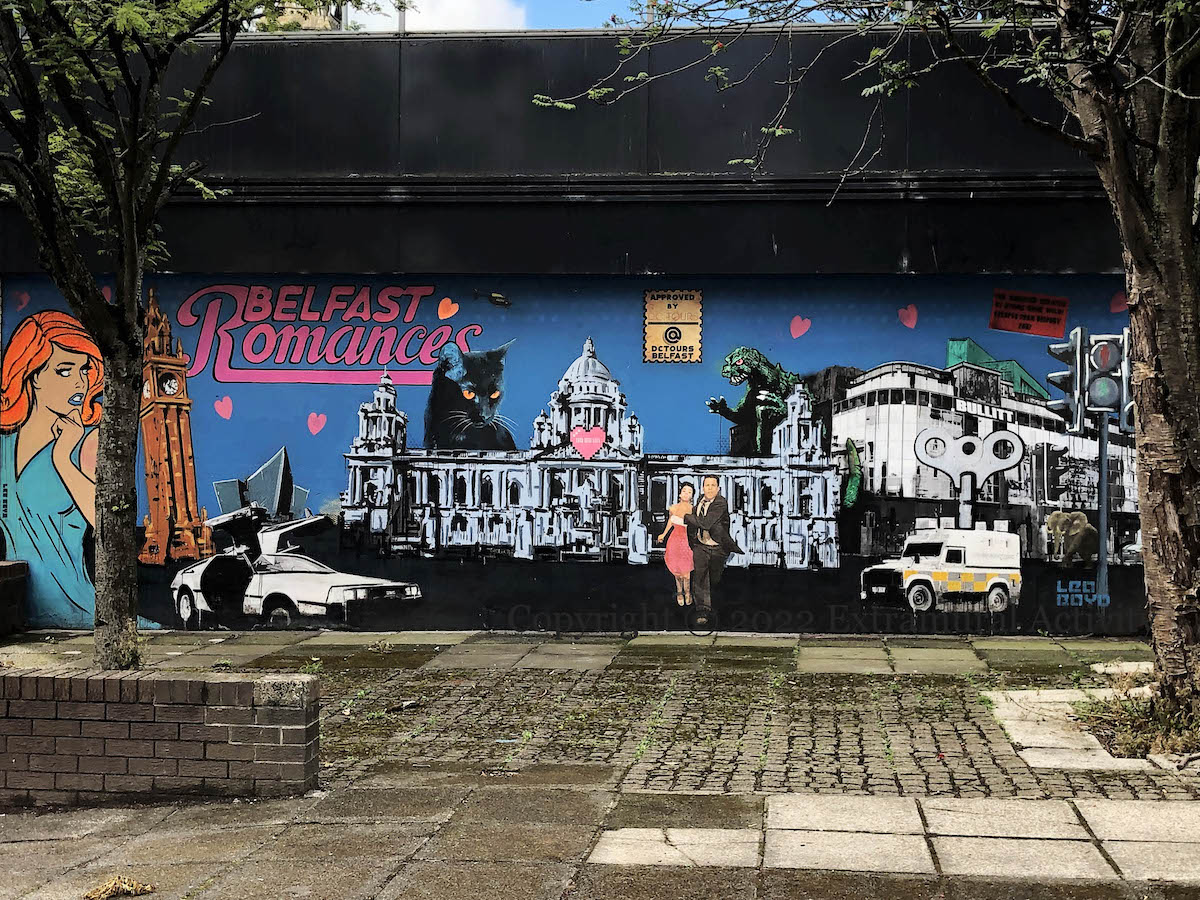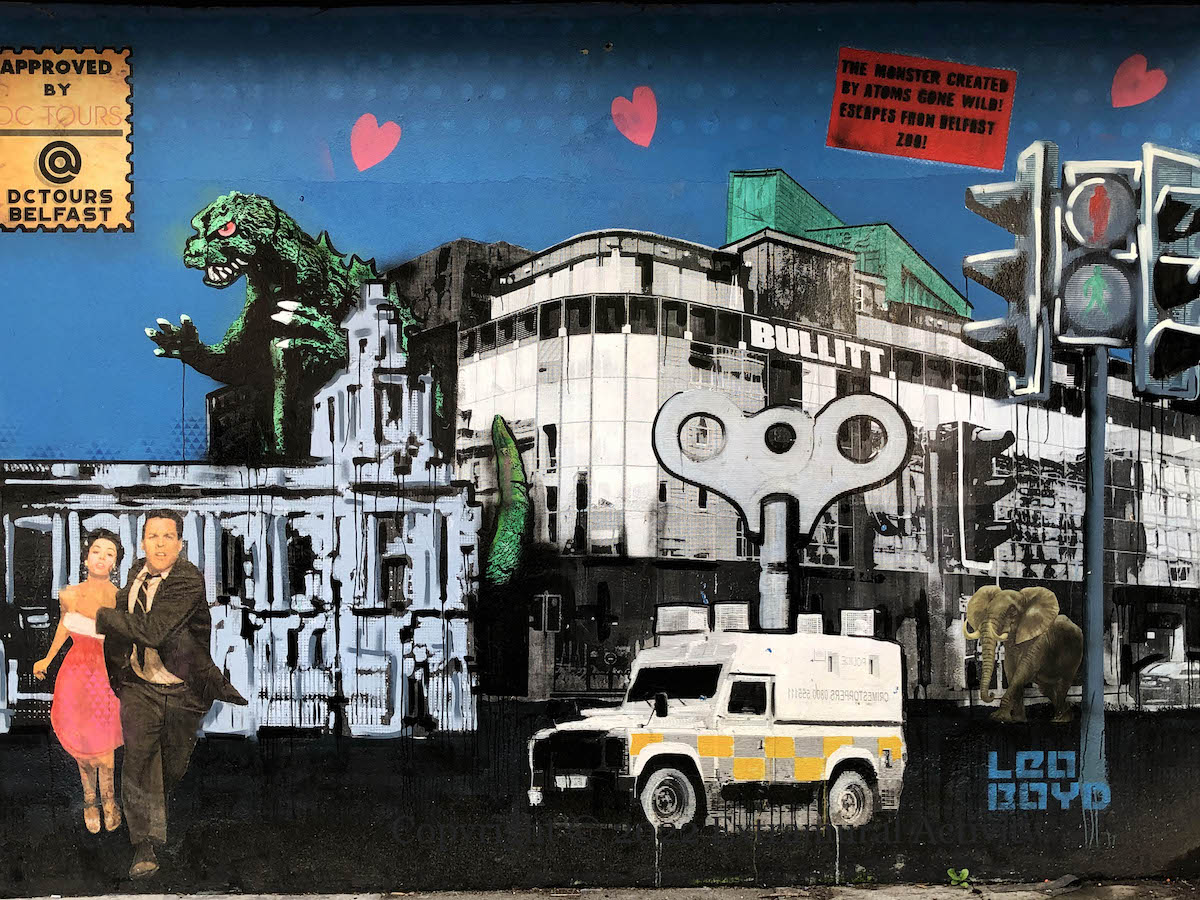 Work by Leo Boyd (web | ig) – and five other artists – is currently showing in The National in High Street. Today’s post shows 2019’s ‘Belfast Romances’ – still rolling in Victoria Street – featuring many familiar Boydisms: When Urban Love Goes Wrong, Belfast Kitty Hall, DeLorean cars, Godzilla – “The monster created by atoms gone wild! Escaped from Belfast zoo”, and the wind-up police land-rover.
