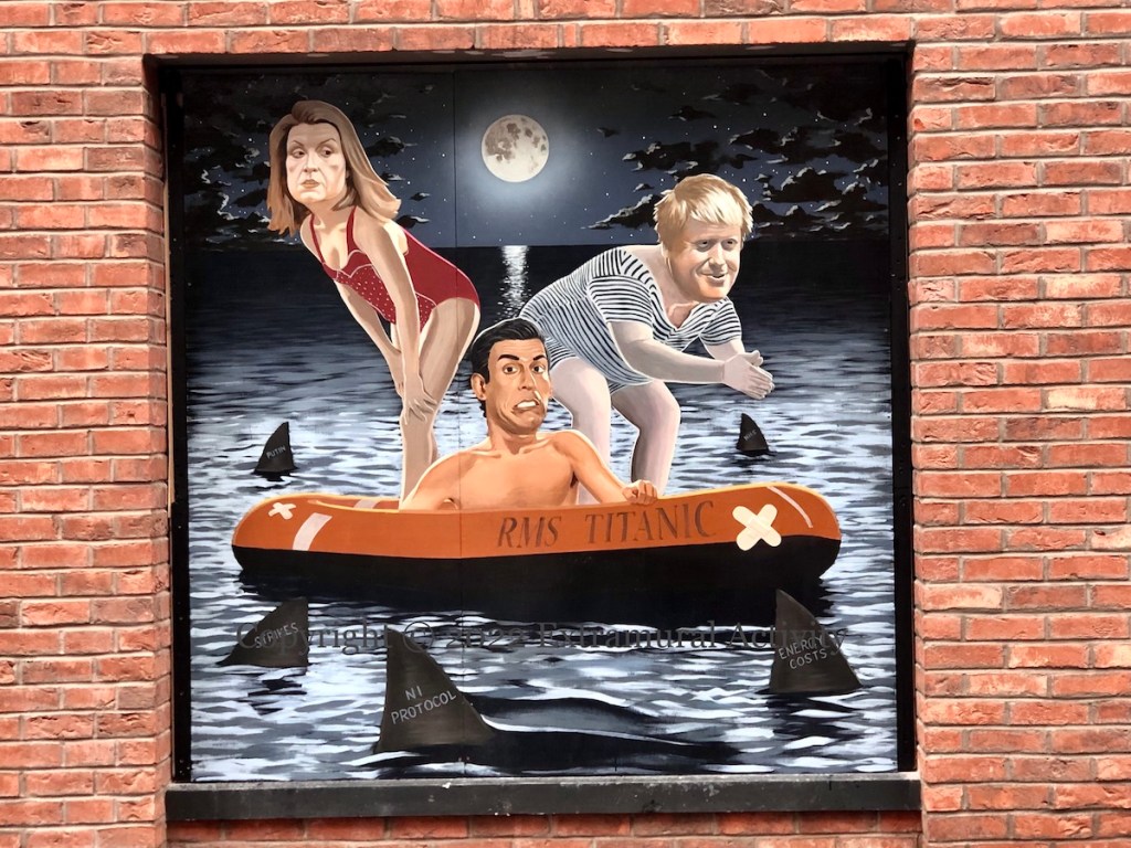 Liz Truss’s Titanic hit not one but a series of icebergs (described previously in Broken Promises) and announced her resignation as leader of the Conservative party, and therefore as UK prime minister, on October 20th, triggering another leadership contest, with the previously-defeated Rishi Sunak back in the running in addition to – for a day, at least – former PM Boris Johnson; the third person shown is Penny Mordaunt. In the end, Sunak went unopposed (WP) and left the lifeboat to join the circling sharks: Putin, strikes, NI Protocol, energy costs.