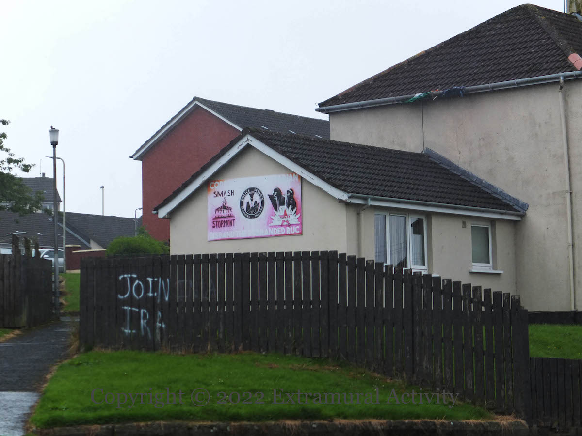 Above, in Iniscarn Road, “Irish republican prisoners still interned within British Gaols in Ireland”. Below that, two from Central Drive, “Support our hunger strikers in Ireland” (explained in Are You On The Side Of The 2020 Hunger Strikers?) and an aging “Disband the rebranded RUC” (seen previously in 2019).