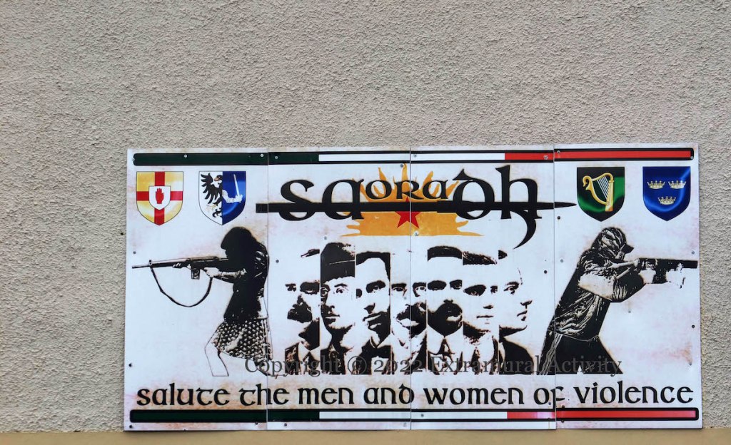 And at the bottom, two from Westland Street, “Irish republican solidarity with Palestine” (described in a north Belfast appearance) and “Salute the men and women of violence” (for which see Her Old Tradition Of Nationhood) and one from the gaggle of boards next to Free Derry Corner: “Support republican prisoner”.