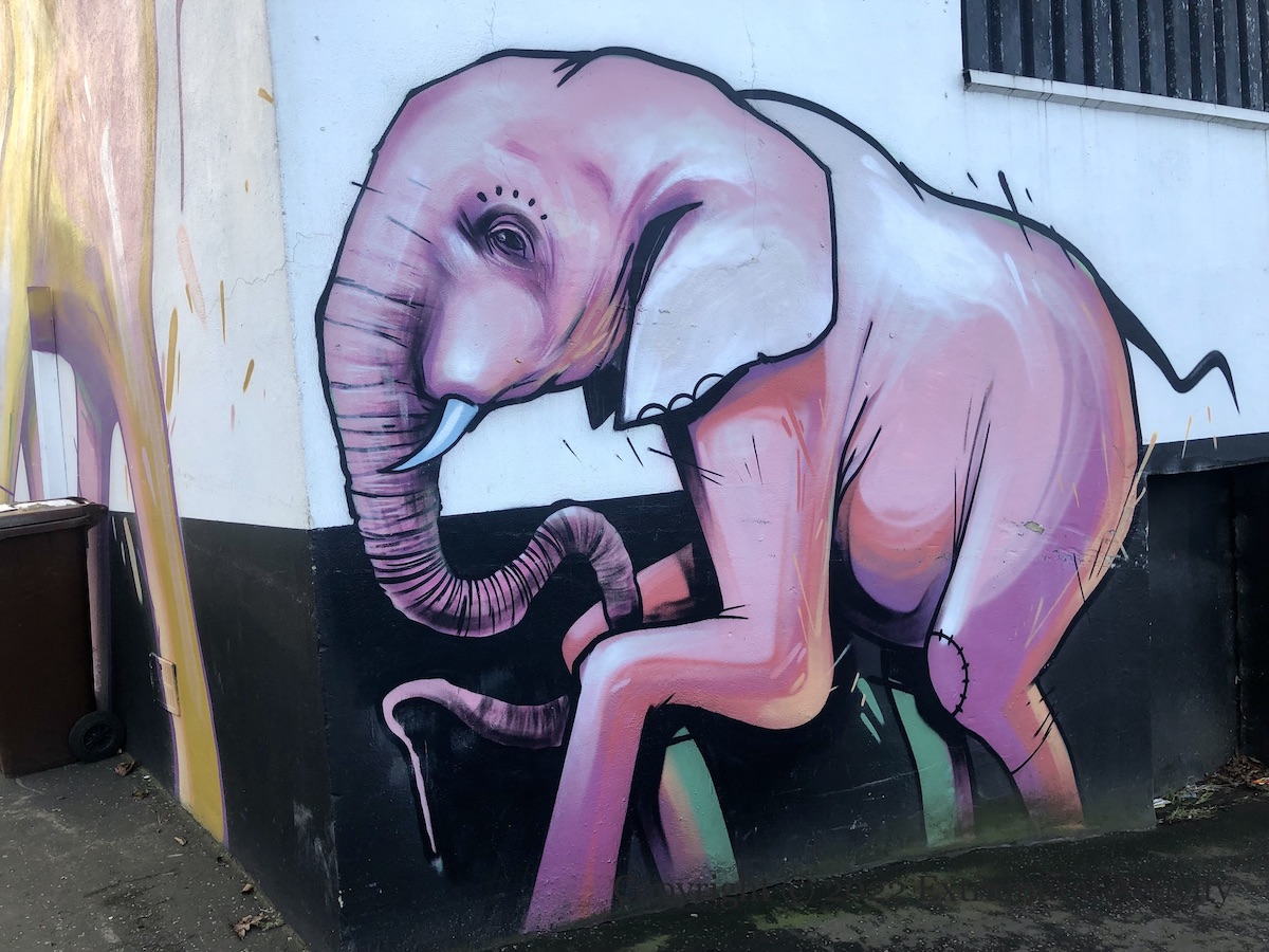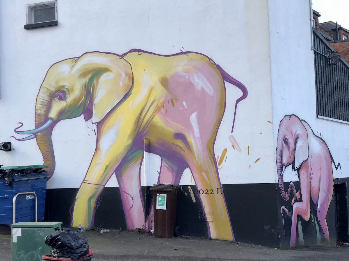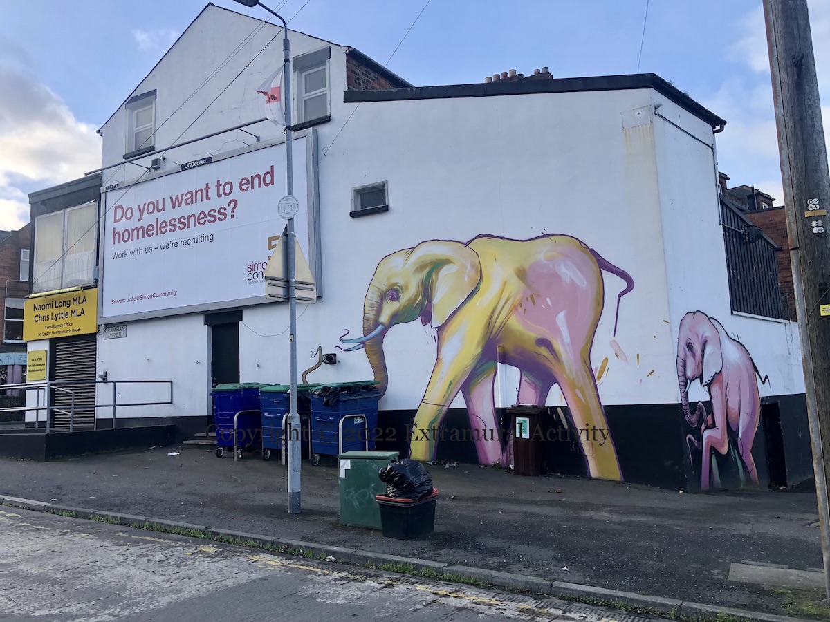 Elephants walk in single file and young elephants often hold the tail of an adult. This pair by South African artist Falko One (ig | Fb) is on the exterior wall of the Alliance Party’s east Belfast constituency office. (Chris Lyttle is no longer in the office – he took up a job with the IFA in July – BelTel).