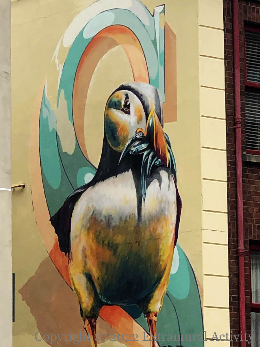 Lahinch street artist SUFEK brings a puffin from the west coast to Derry for the “Roots Street Art” festival (Derry Journal) in 2021.