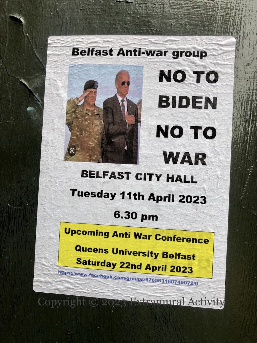 In the same vein is the poster below from the “Belfast Anti-war group” advertising rally outside city hall and an upcoming conference at Queen’s: “No to Biden, no to war”