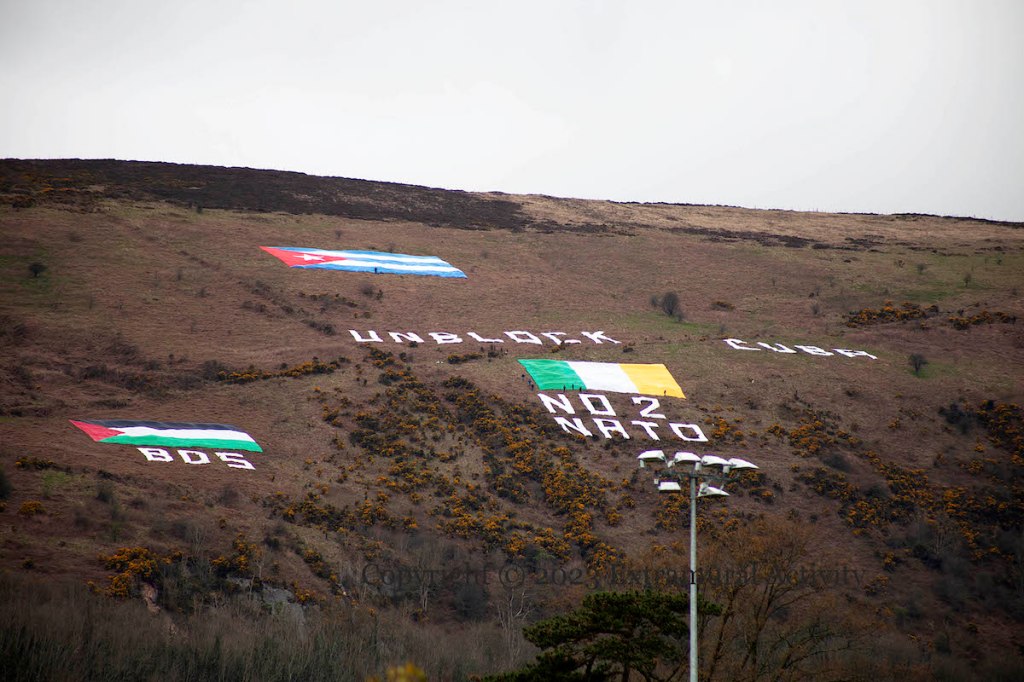 A trio of international causes aimed at the visiting Joe Biden, president of the United States, from Gael Force Art and People Before Profit. What’s new here is the “No 2 NATO” under the Irish Tricolour. The other two parts have been on the mountain previously: the Cuban flag with “unblock Cuba” reprises the maassive Cuban flag on the mountain in 2021, which was depicted in the La Solidaridad Invariable mural on Divis St, and the Palestinian flag with “BDS” [Boycott, Divestment, Sanctions] in 2018’s #BDS.