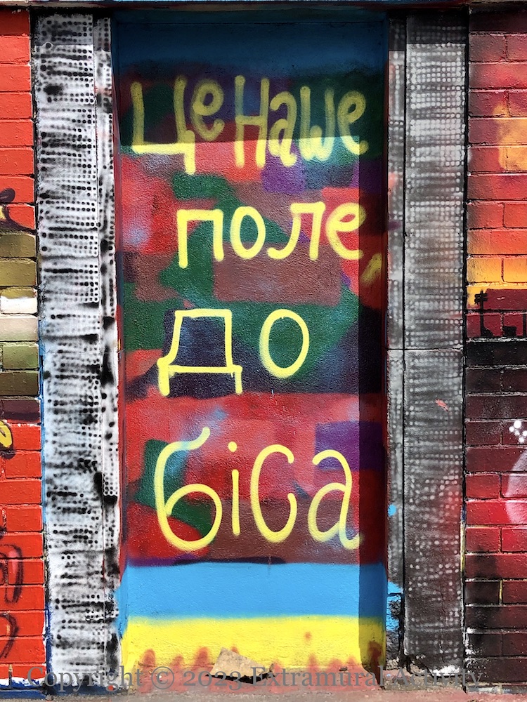 Hallion – “Цe нaшe поле до біса” [this is our hell on earth] – a common description of the battle for Bakhmut by Ukranian soldiers (AP | France24 | CNN); this was the last of several slogans painted by Hallion throughout the festival (tw)