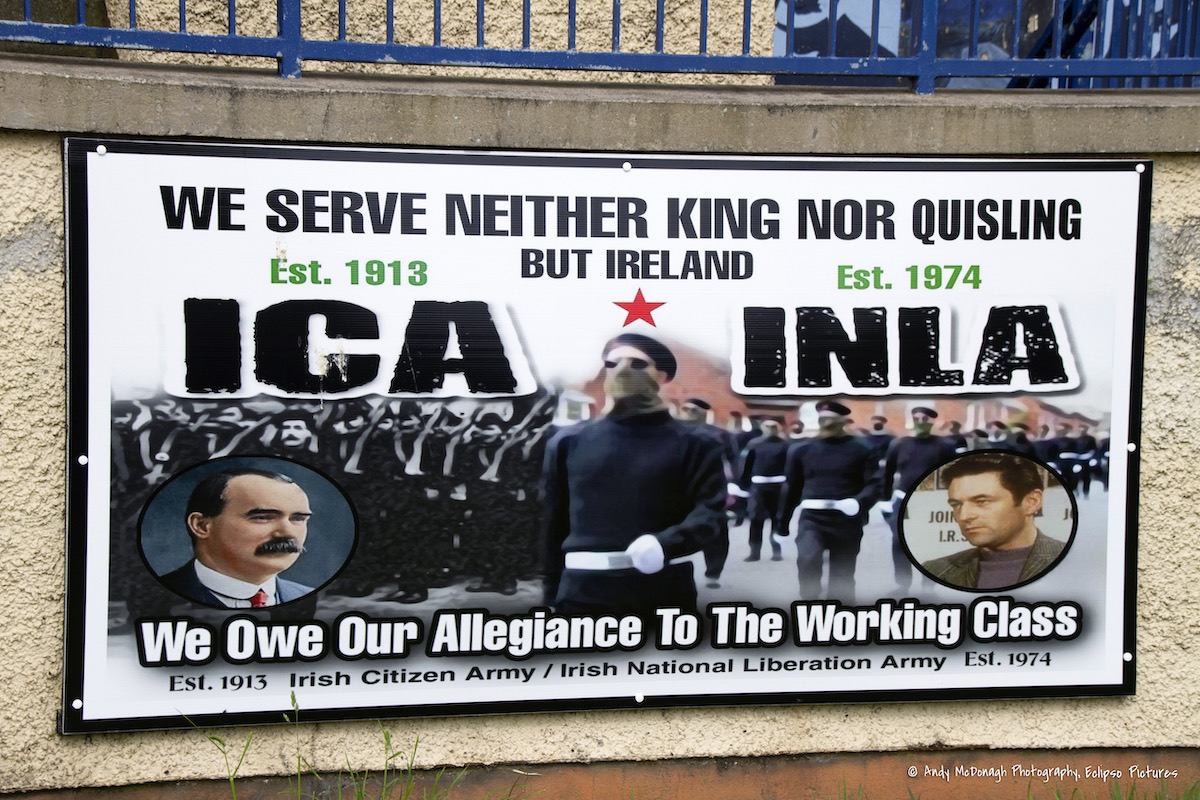 “Est 1913 Irish Citizen Army / Irish National Liberation Army Est. 1974”. The Irish Citizen Army was founded in Dublin in 1913 to protect striking workers from police violence. After taking part in the Easter Rising of 1916, however, the ICA did not participate in the War Of Independence and the Civil War. In 1974, some founding members considered reviving the “ICA” name to reflect the organisation’s “allegiance to the working class” while Costello (pictured on the right) suggested “National Liberation Army”, which was then amended to include “Irish” (History Ireland | WP | WP). MNI includes an “ICA-INLA” Starry Plough on the stairs into the New Lodge from 1989 (C00105).