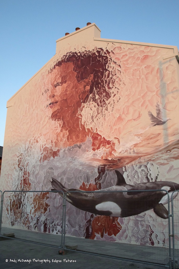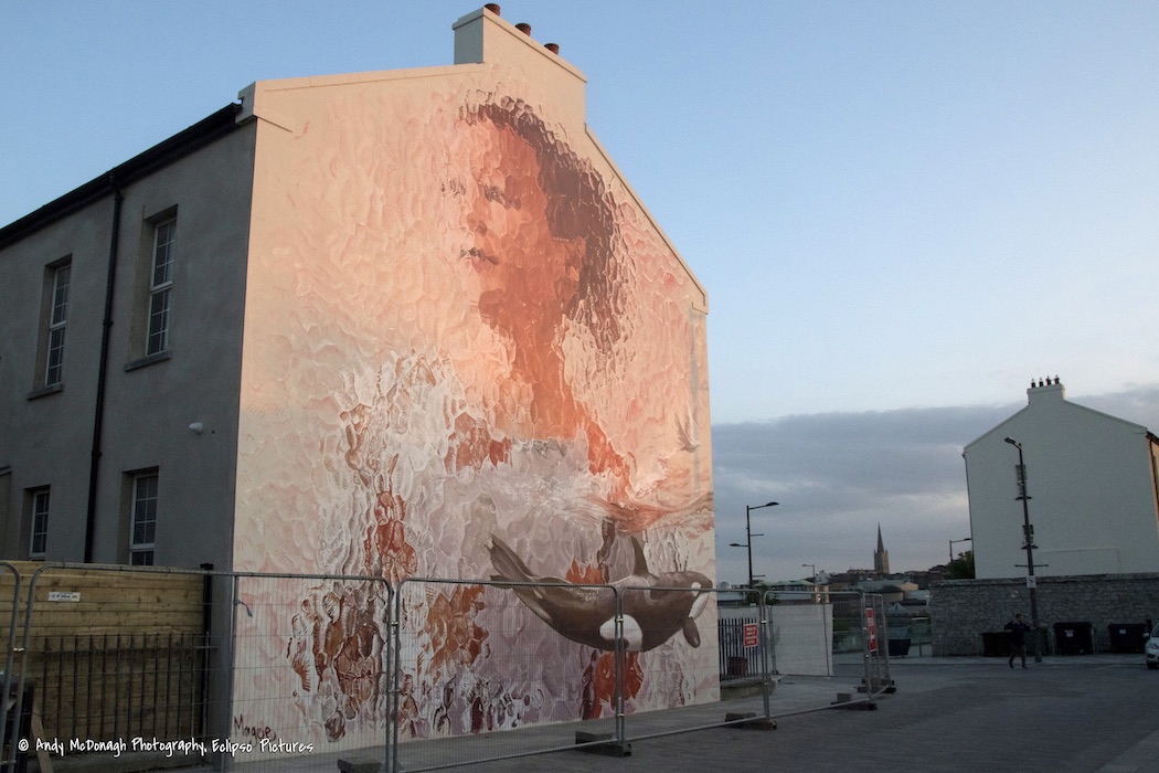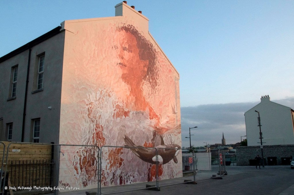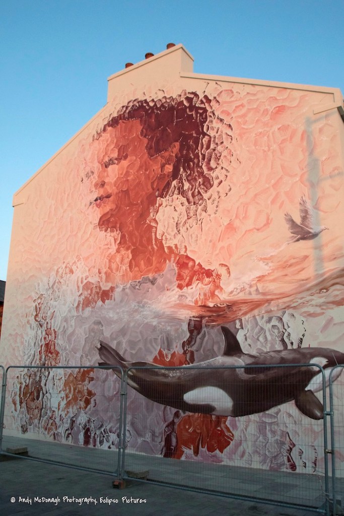 Australian artist Fintan Magee (ig) in Ebrington Square, Londonderry, showing a young girl – a symbol of the next generation – (Bel Tel) behind obscure glass. To the right is a dove; the orca in the bottom right is Dopey Dick, who swam up the Foyle in 1977 (Fb).
