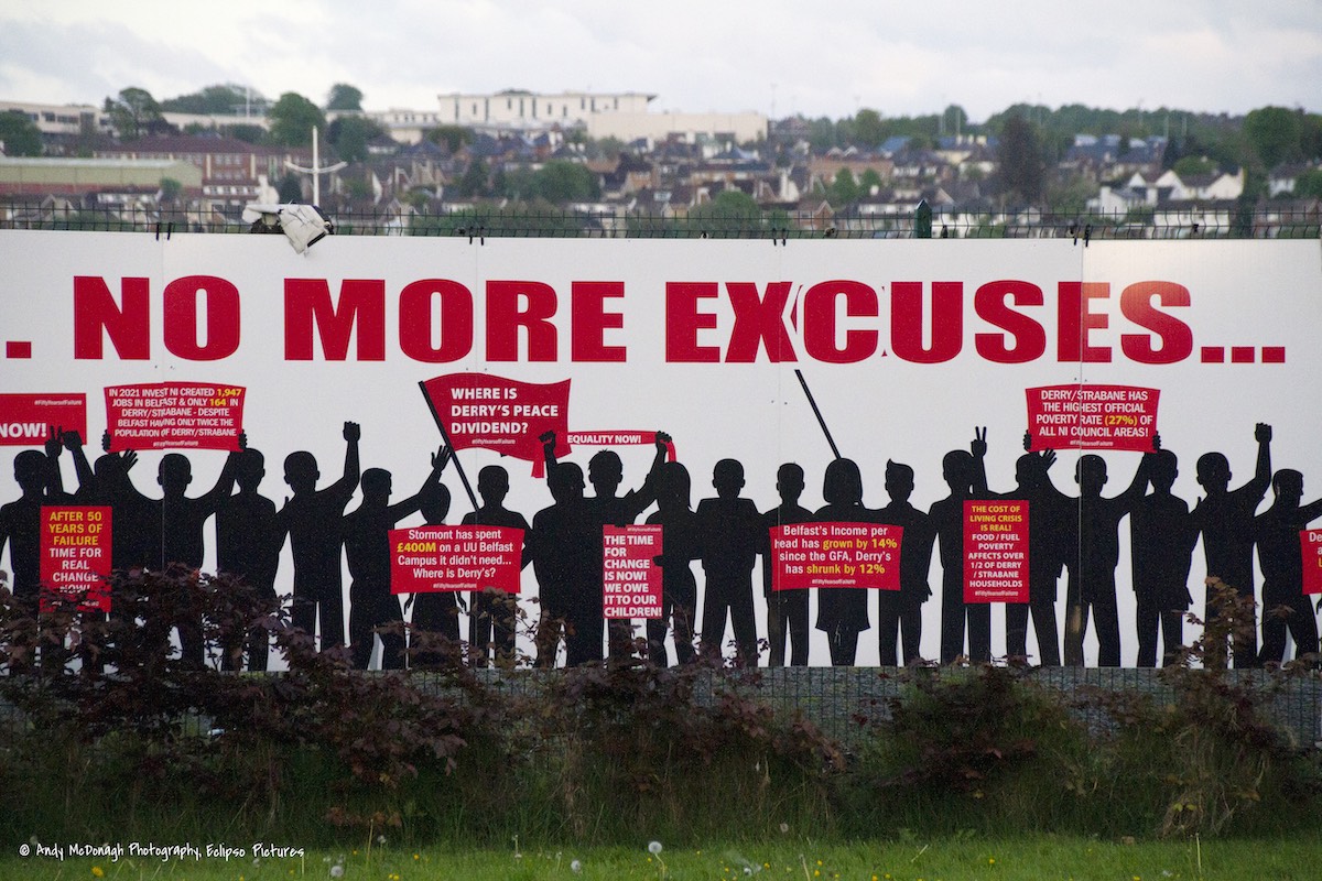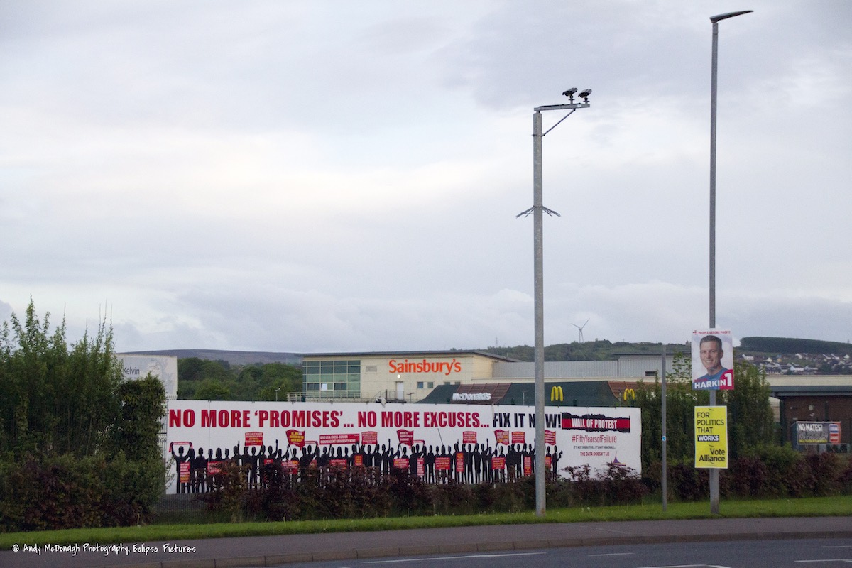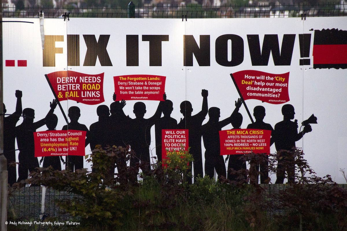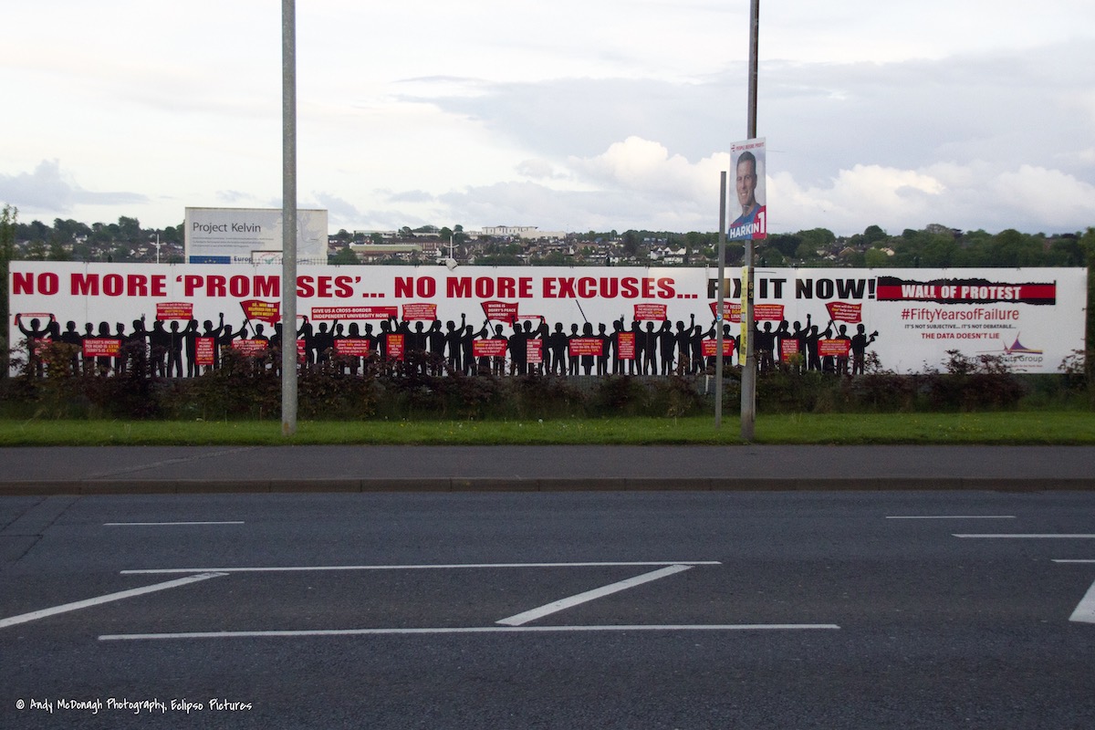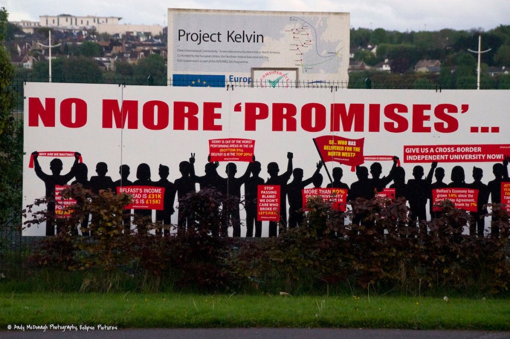 The general concern of this campaign is persistent under-investment in Derry and the northwest. One of the placards reads carried by a protester reads, “Belfast’s economy has grown 14% since the [1998] Good Friday Agreement, Derry’s has shrunk 7%” but the complaint goes back “fifty years”, based on the approval in 1965 (BBC) and construction by 1968 of what was initially called the “New University Of Ulster” at a new site in Coleraine rather at Magee University College in Derry. The final panel of the long board includes the logo of the Derry University Group “fighting for a cross-border independent university for the north west” (tw). (1965 was also the year that Craigavon was created.)