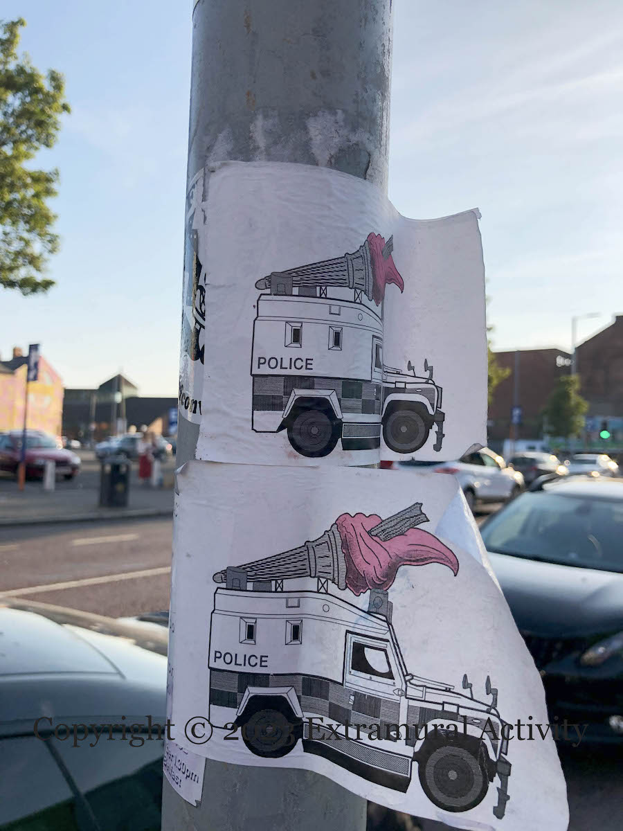 A couple of Leo Boyd (ig) paste-ups of his PSNIce-Cream land-rover (previously a mural in Kent St) are peeling off the pole in North Street, perhaps in part because of the recent warm temperatures.