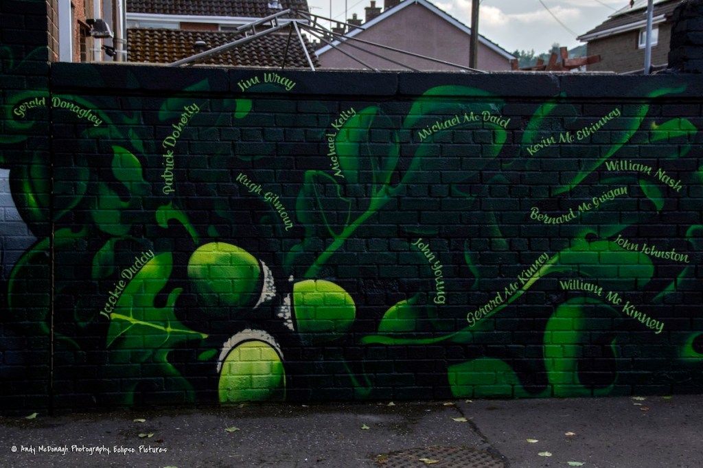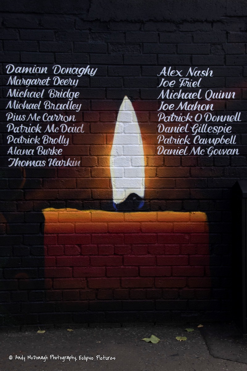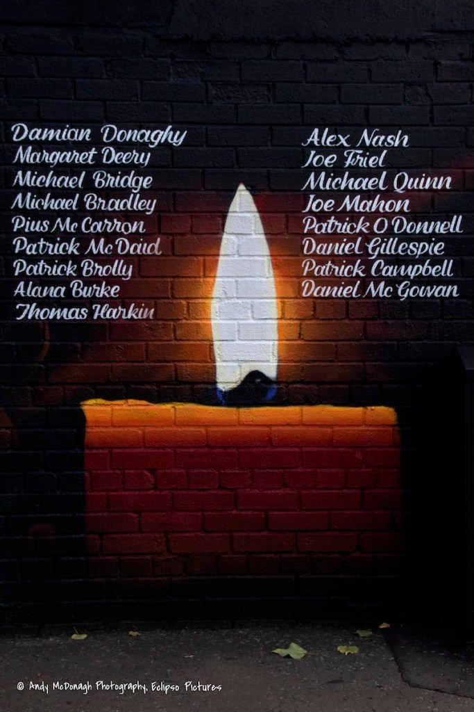 The names of the 14 dead and 17 injured on the side walls were painted by Paddy Nelis (tw). His previous work includes the 2013 Brıogáıd Dhoıre mural in Lecky Road and in 2022 (with Razer) the Bogisde mural to his brother, Donncha Mac Nıallaıs.
