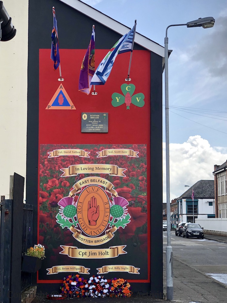 The hand-painted UVF Scottish Brigade mural (see Boab Kerr) in Beechfield Street/Tower Street has been replaced by this new printed board. The plaque to Kerr has been retained, but four names have been added – David Totten, Brian Milligan, Billy Inglis, and Jim Holt, who is now the most prominent. Holt died in February 2021 (ACT Fb).