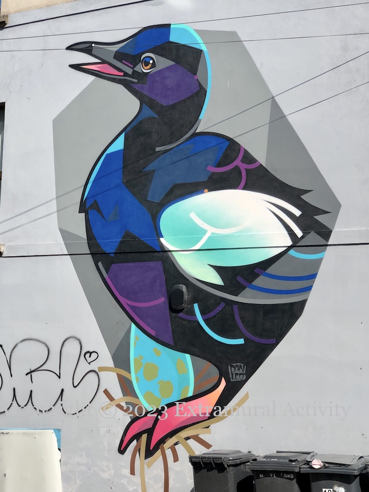 The guillemot is distinctive for its red “gape” (inside of mouth). It spends most of its time on and around water but nests on cliff ledges and other remote spaces in May (BirdWatchIreland). The pointed shape of the egg makes it less likely to fall off cliffs (British Birds). They have been nesting in Bangor since at least 1911 (Geograph). If you can’t spot any at the marina, you can check out this mural by Dan Leo (ig) in nearby Victoria Road.