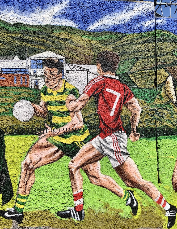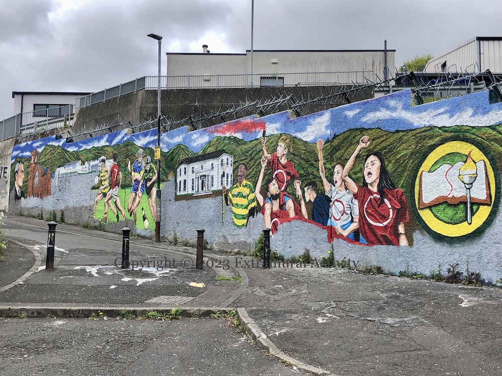 The theme of preserving and promoting the Irish language occurs in several places in the mural: next to Pearse we see his saying, “Máırtín Ó Chadháın ” [a land without a language [is] a land without a soul], in the classroom scene we have “Labhaır í agus maırfıdh sí” [speak it and it will endure], and finally we see the Dream Dearg protesting for an Irish-Language Act (see previously #AchtAnoıs).