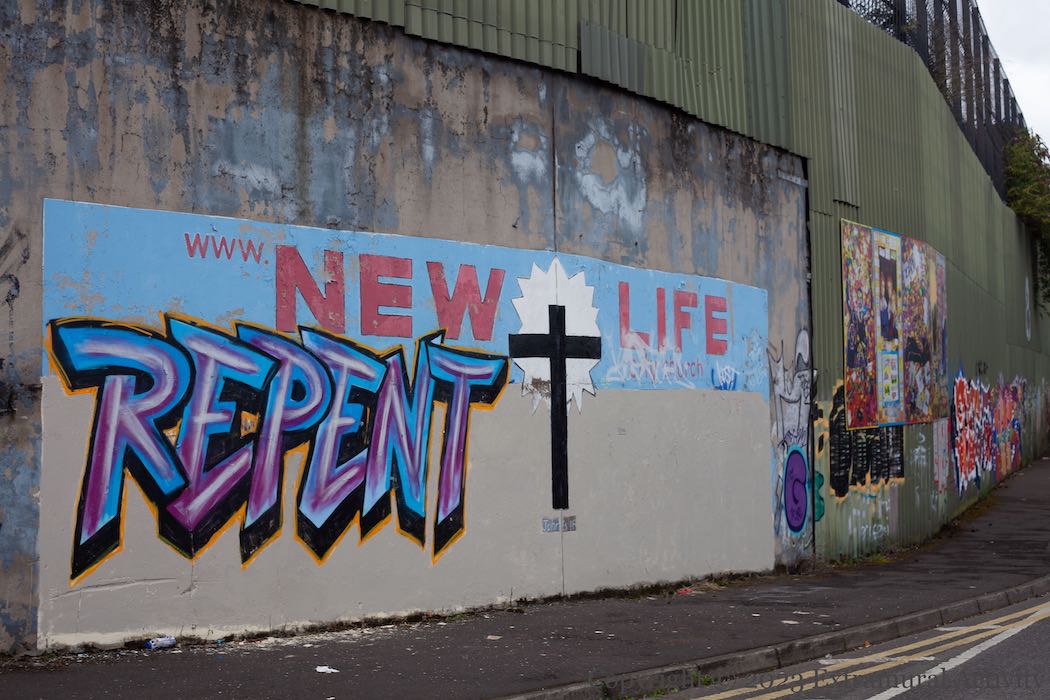 The graffiti on the bottom part of the New Life City Church (web) mural on the west Belfast “peace” line has been painted out and this mild wild-style “repent” added.