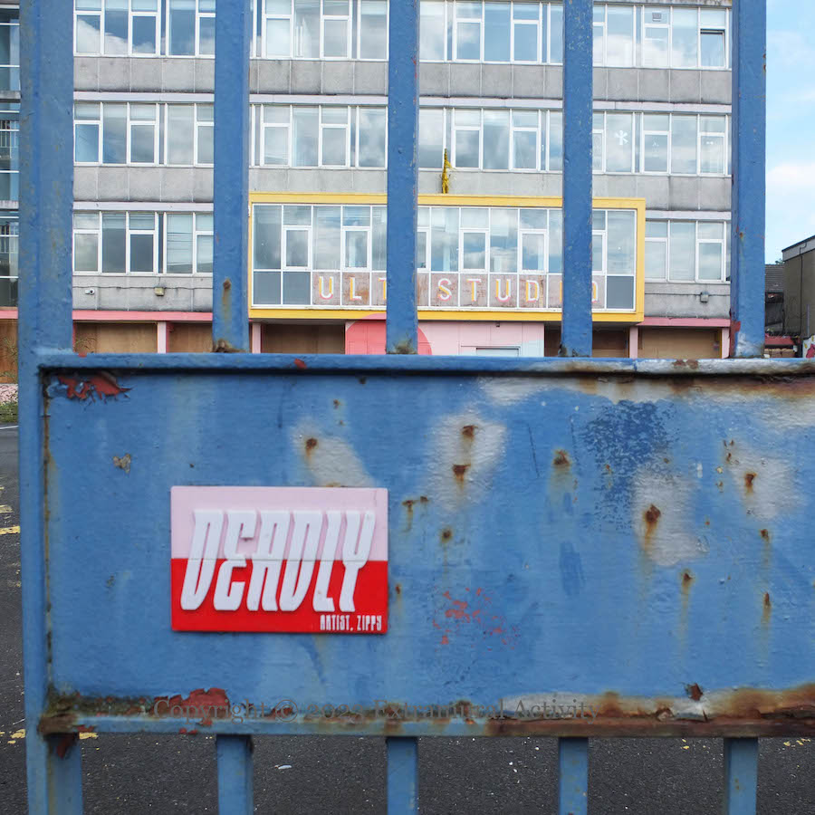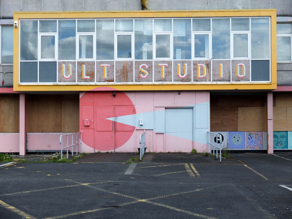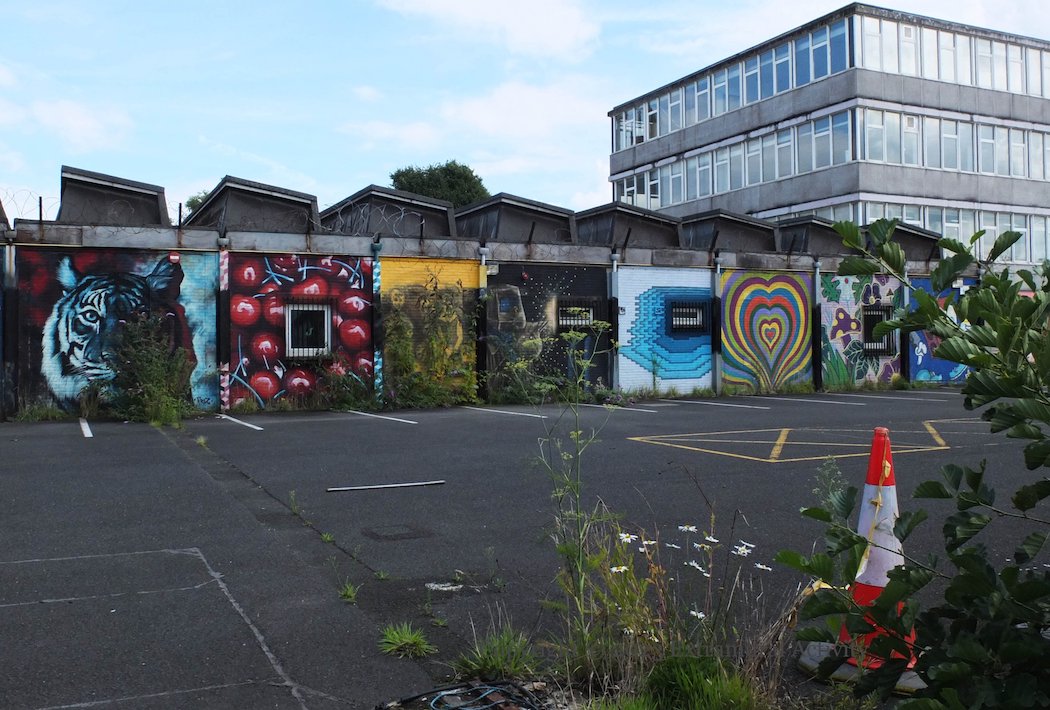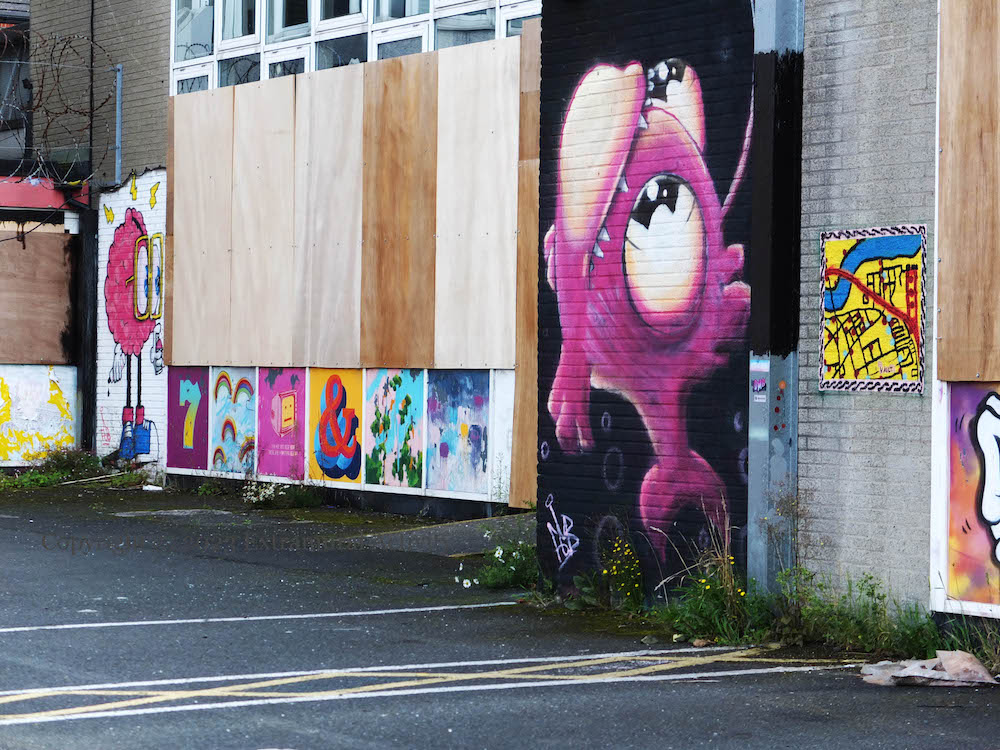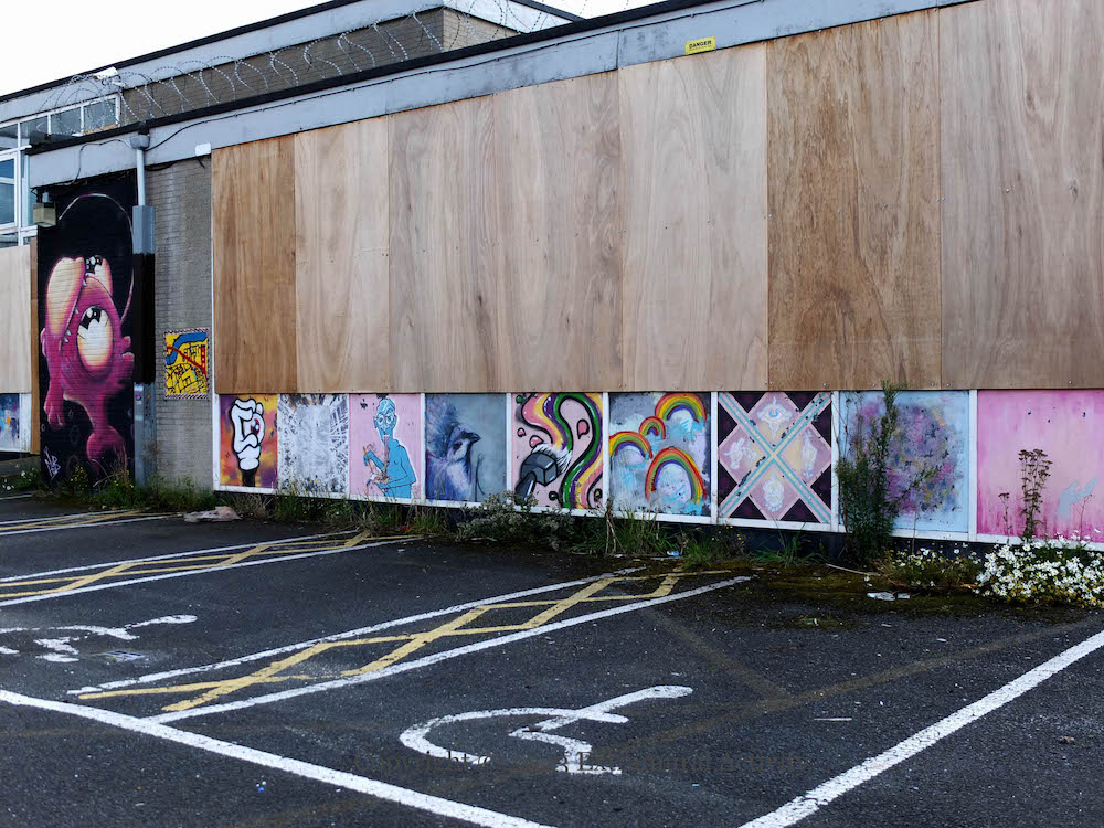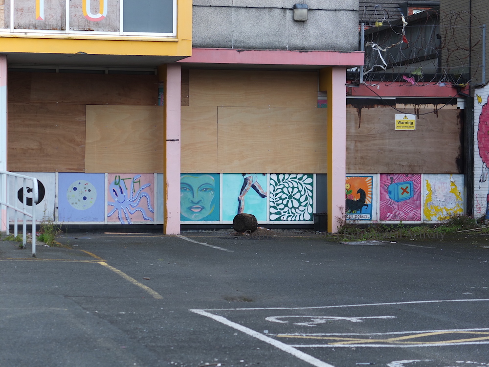 Here is a gallery of images from the now locked-up and boarded-up (and over-grown) Vault building, formerly the Belfast Met, awaiting demolition and redevelopment as housing. The images below move from left to right beginning with a piece that has not been featured before (outlines of human figures, with hearts on their chests); for the others, see Vault Guard Cat | Show Some Love | Build Communities | Vaulty Towers | In Bloom | Bizarre Bazaar .