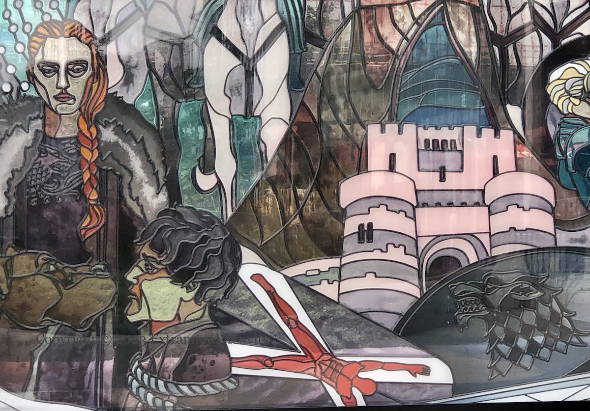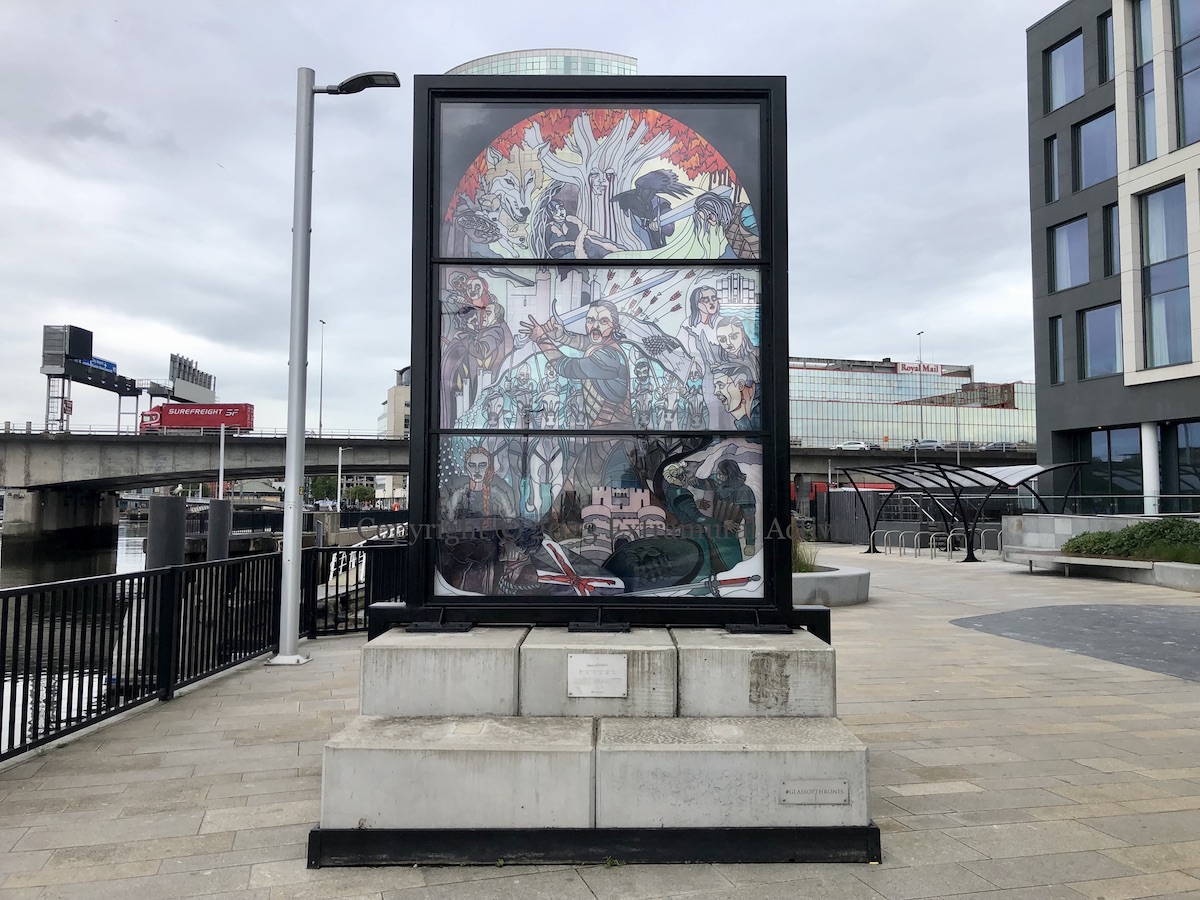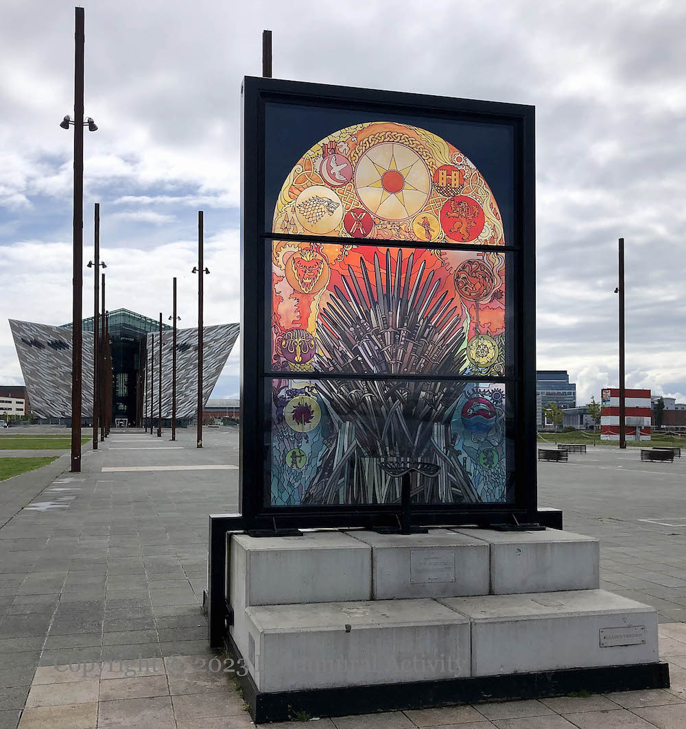 Titanic Studios in the Titanic Quarter of Belfast provided one of the primary filming locations for the hit HBO series Game Of Thrones. The series ended in 2019 but its influence lives on in a series of free-standing stained-glass “windows” on “Maritime Mile” (web), the tourist attractions around the Titanic museum.