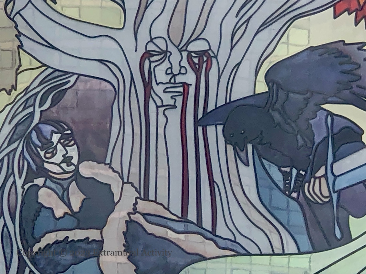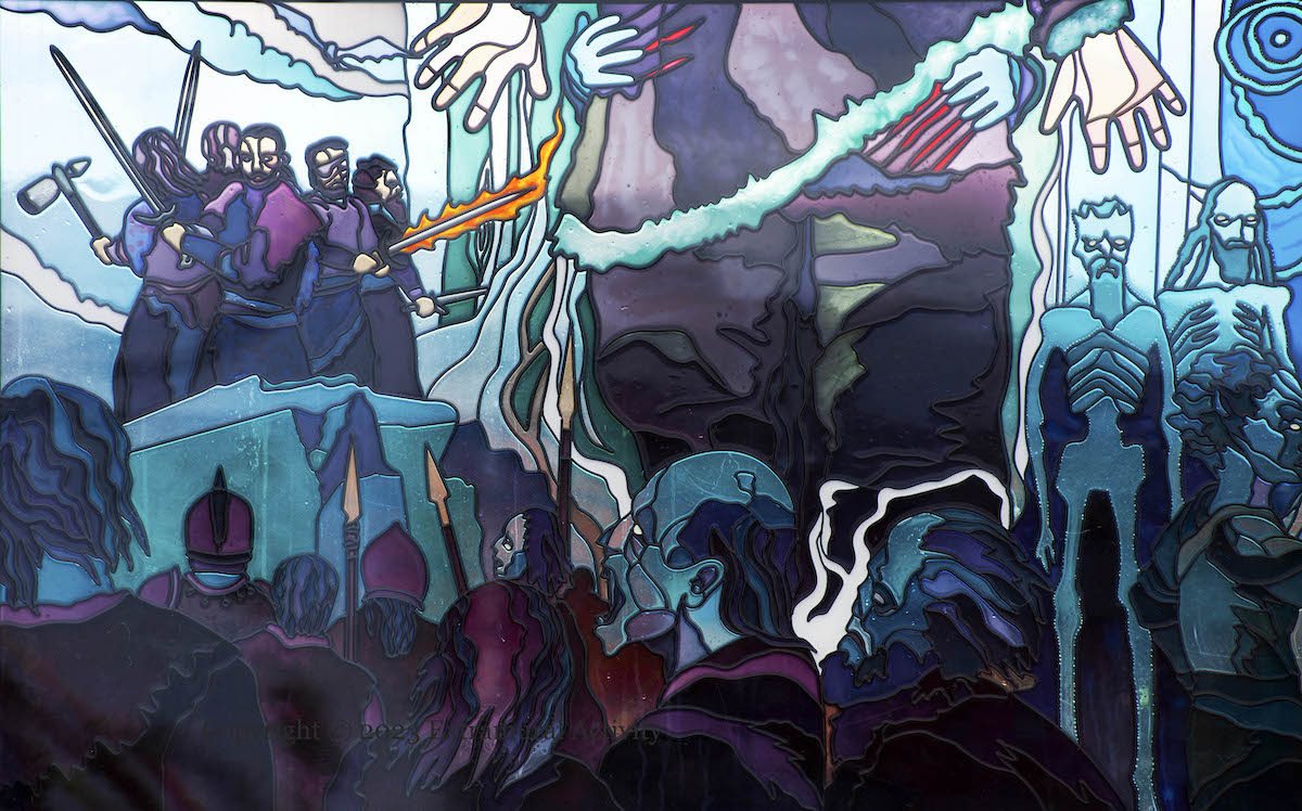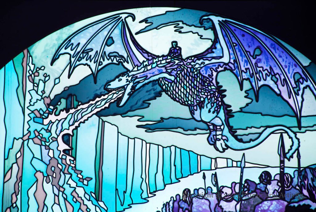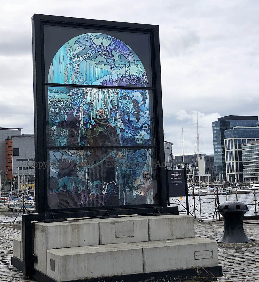 Titanic Studios in the Titanic Quarter of Belfast provided one of the primary filming locations for the hit HBO series Game Of Thrones. The series ended in 2019 but its influence lives on in a series of free-standing stained-glass “windows” on “Maritime Mile” (web), the tourist attractions around the Titanic museum.