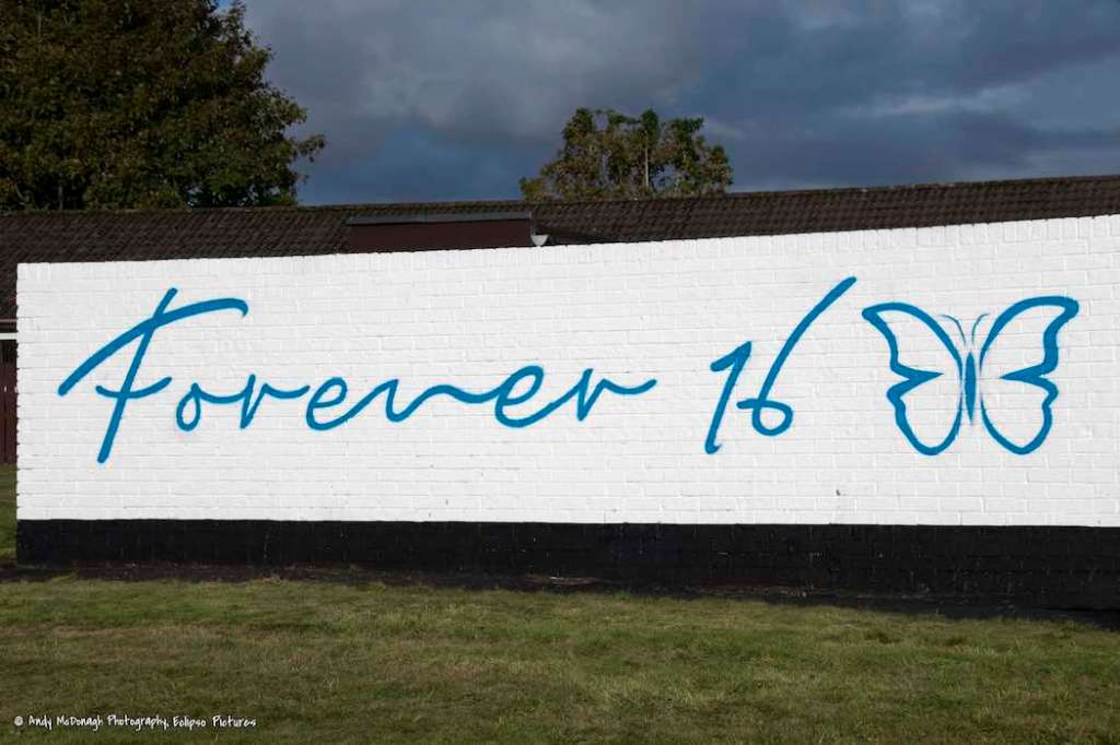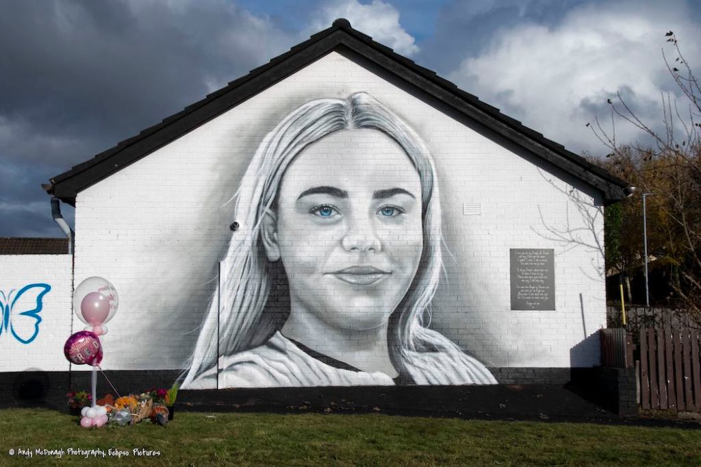 Caitlin McLaughlin died suddenly on June 24th. She collapsed from a heart attack as she walked to the bus station in Belfast to return home from a music festival at which she had taken ecstasy (BBC). A requiem mass was held in Galliagh on the 28th (BelTel) and the mural shown here was launched in Brookdale Park on October 27th, which would have been Caitlin’s 17 birthday (Belfast Live).