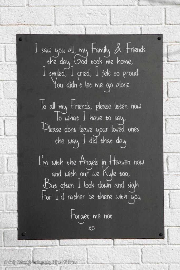 “I saw you all, my family & friends/the day God took me home,/I smiled, I cried, I felt so proud/You didn’t let me go alone//To all my friends, please listen now/To what I have to say,/Please don’t leave your loved ones/the way I did that day//I’m with the angels in heaven now/and with our we[e] Kyle too,/But often I look down and sigh/For I’d rather be there with you//Forget me not/XO”