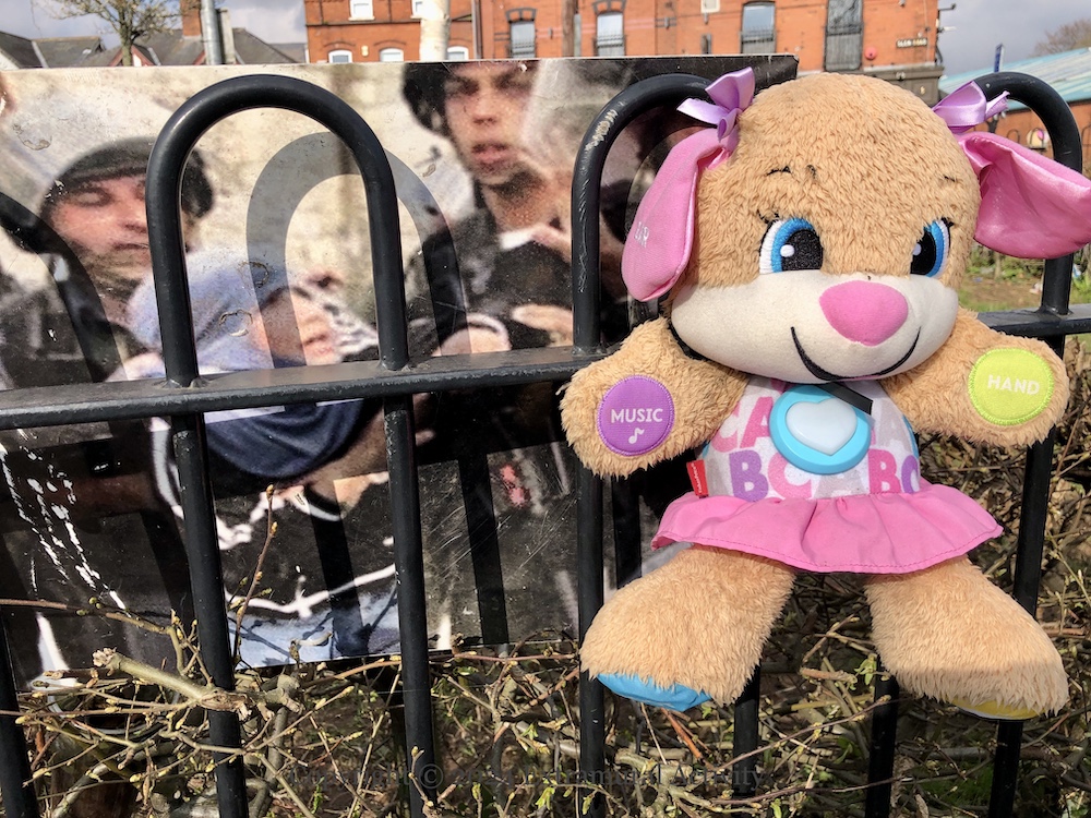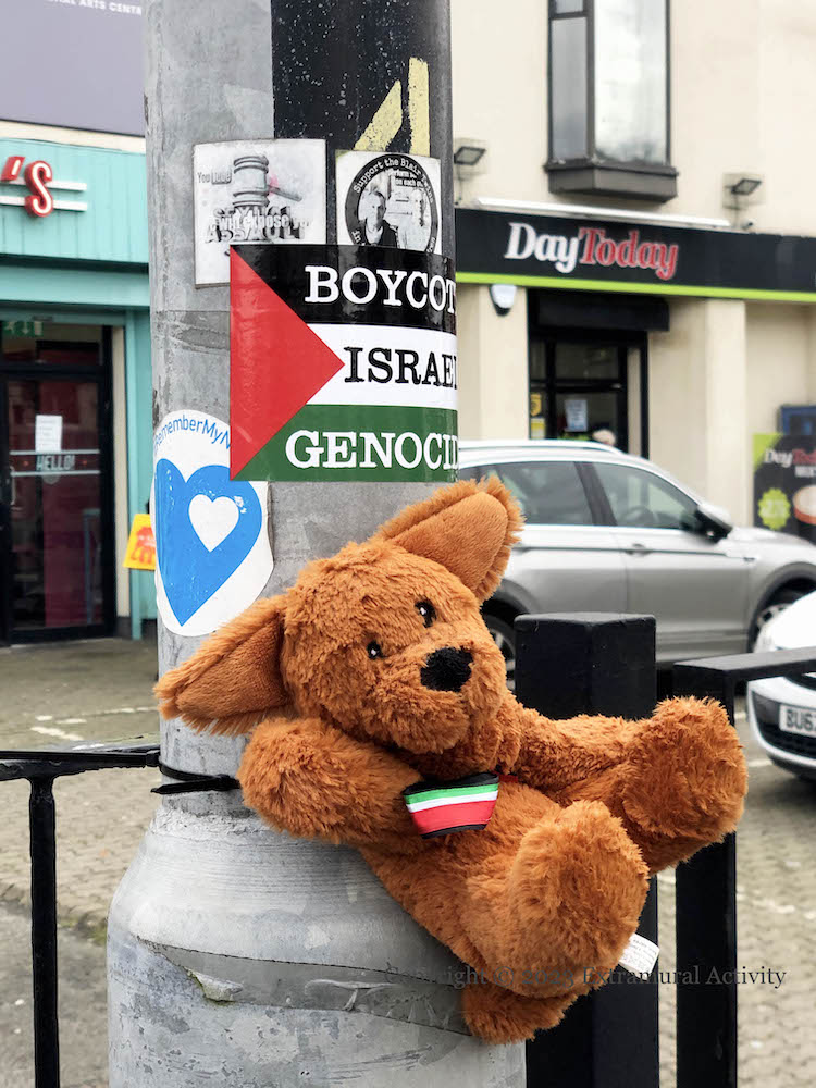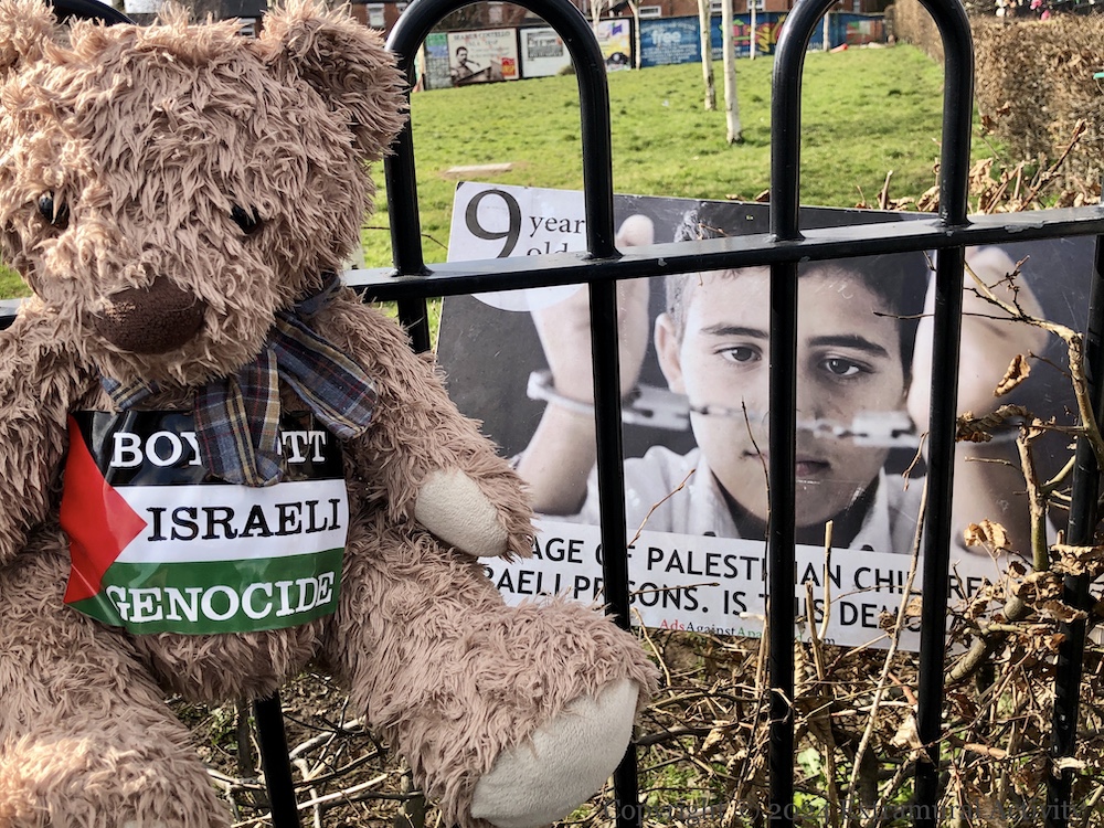 The UN Security Council last night passed resolution 2712 (UN), calling for extended humanitarian pauses in Israel’s assult on Gaza. The resolution was proposed by Malta, who wrote the resolution to focus on the plight of children. Today’s images show a selection of the teddy bears and other soft toys that have been placed on fences and lamp-posts in CNR west Belfast in memory of the children who have been killed in Gaza. It is estimated that a child dies in Gaza every 10 minutes (Reuters) and that 4,600 children have died so far (UN).