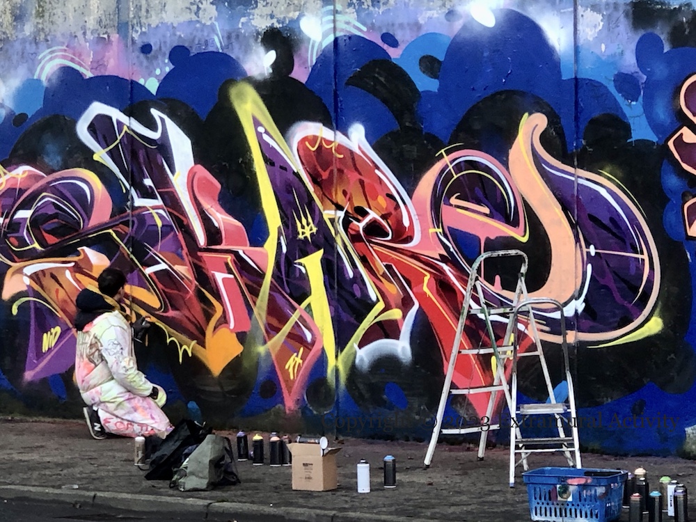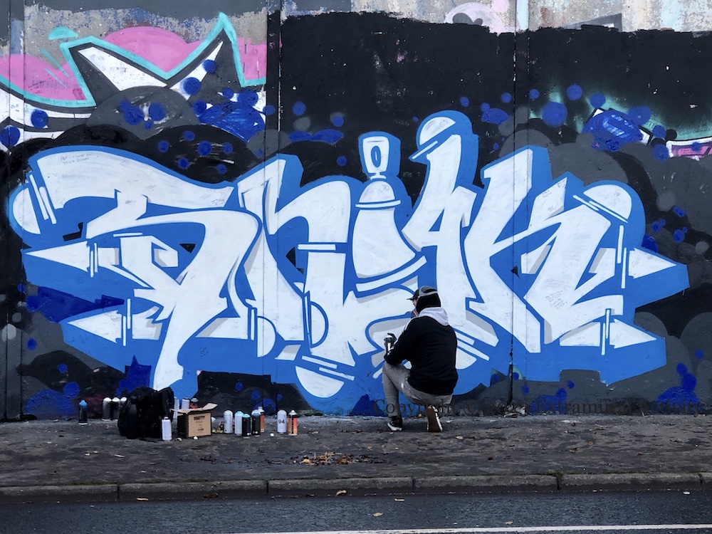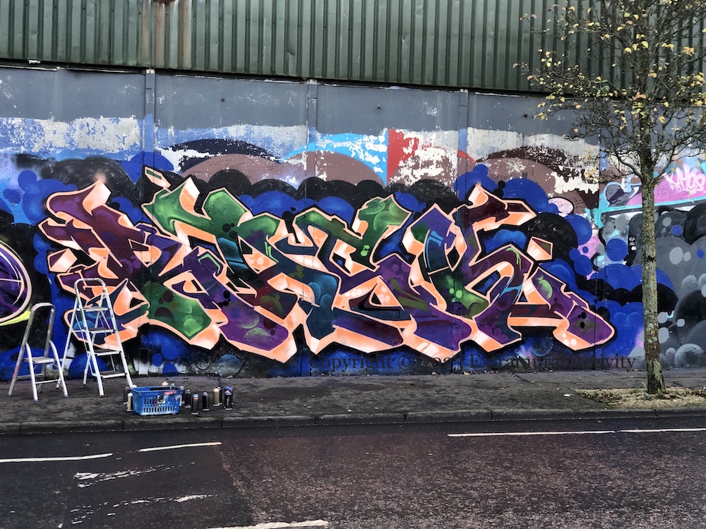 Wild-style writers RASK from Drogheda (ig), SNAK from Derry (ig), and SKARE from Sievierodonetsk, Ukraine by way of Warsaw, Poland, (ig) hit the so-called west Belfast “peace” line on Saturday and left their mark.