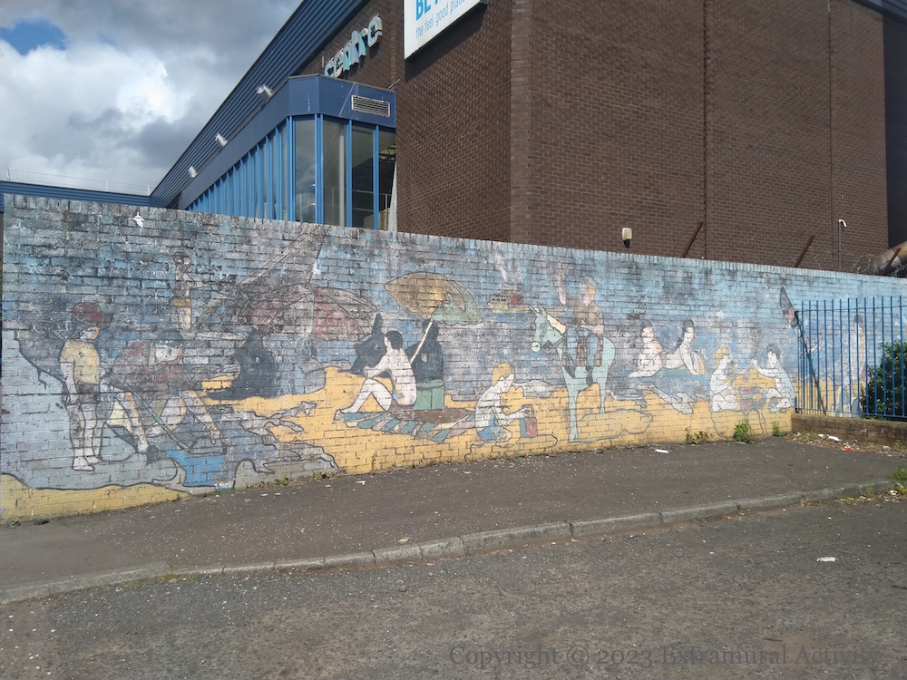 The beach scene at the back of the Shankill leisure centre has existed since at least 2002 (J1439) and perhaps 1996 (C04937). The activities of the holiday-makers are (from left to right) crabbing in a tidal pool, wind-surfing, sandcastle-building, donkey-riding, and swimming; on the far right a dolphin is leaping.