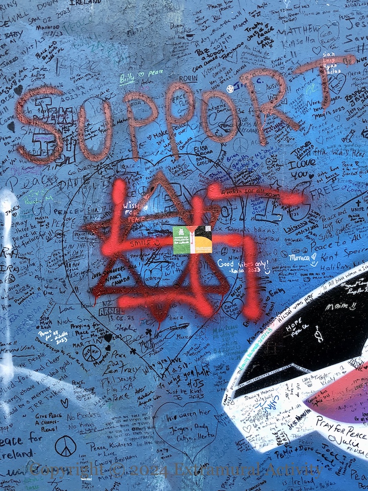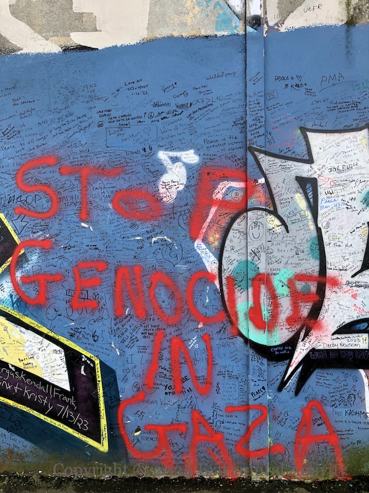 Normally the tourists’ graffiti on the Cupar Way “peace” wall amounts to “Patronising Slogans” but the Hamas-Israel conflict has brought international politics to the wall, with the Star Of David being replaced by a swastika and “Stop genocide in Gaza” in the same hand. There is a march at 1 p.m. today from Writers’ Square to the city hall, organised by the IPSC (Fb), .
