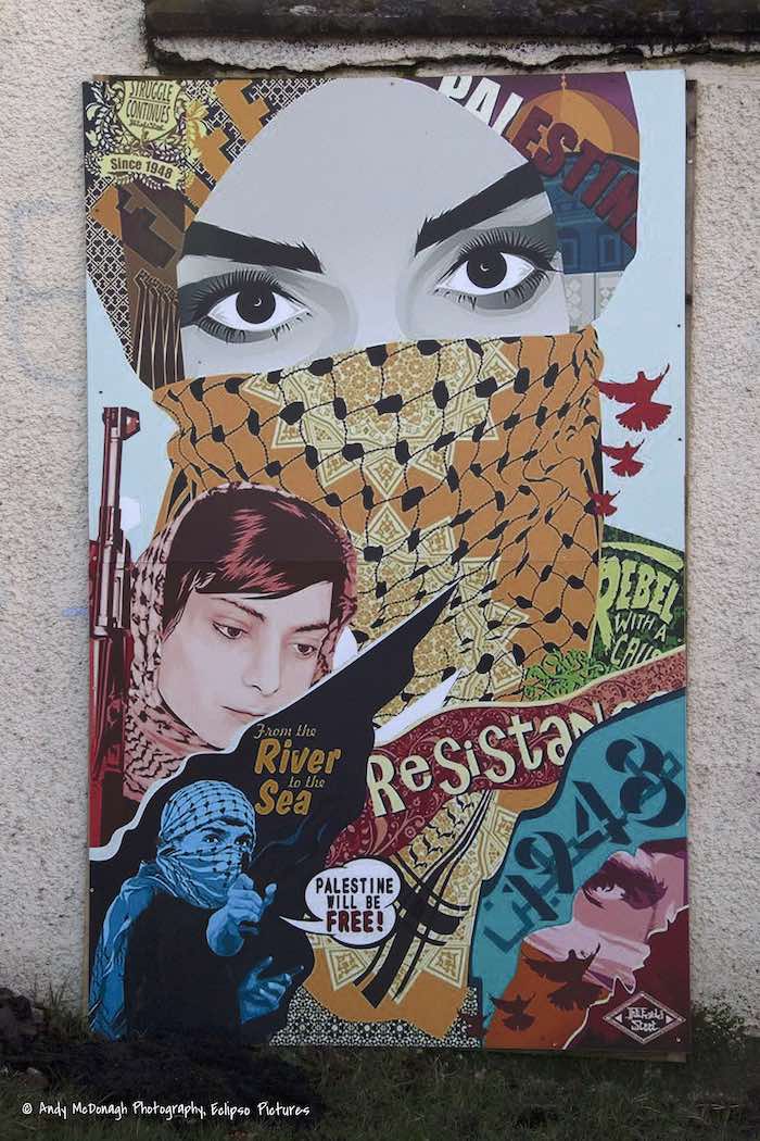 The imagery and references are threatening: included are air-jacker Leila Khaled and a rioter with a catapult (who completes the slogan “from the river to the sea … Palestine will be free!”; the lower part of the face of the main figure (and of the face in the bottom-right corner) is covered; we also see “Rebel With[out] A Cause” the 1955 film. in the top left “Struggle Continues – Since 1948” in the style of a fashion emblem, and in the bottom right, “1948” in the style of a mid-century house-number font or perhaps the 1984 film version (with John Hurt and Richard Burton) of Orwell’s 1984.