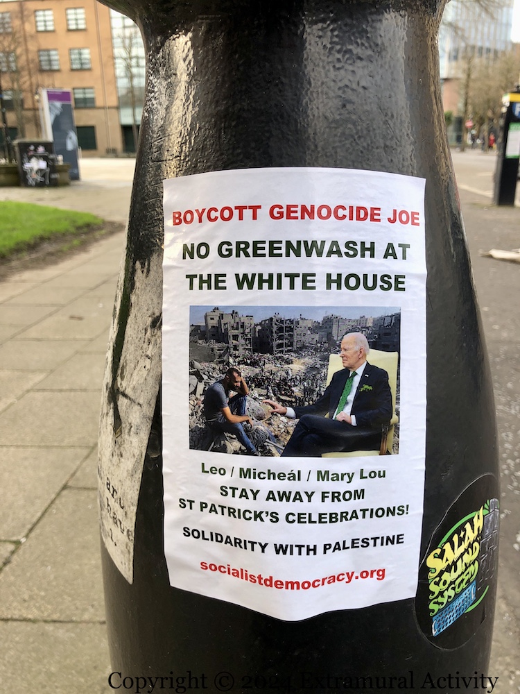 “Boycott genocide Joe. No greenwash at the White House. Leo/Mıcheál/Mary Lou stay away from St Patrick’s Day celebrations! Solidarity with Palestine.”