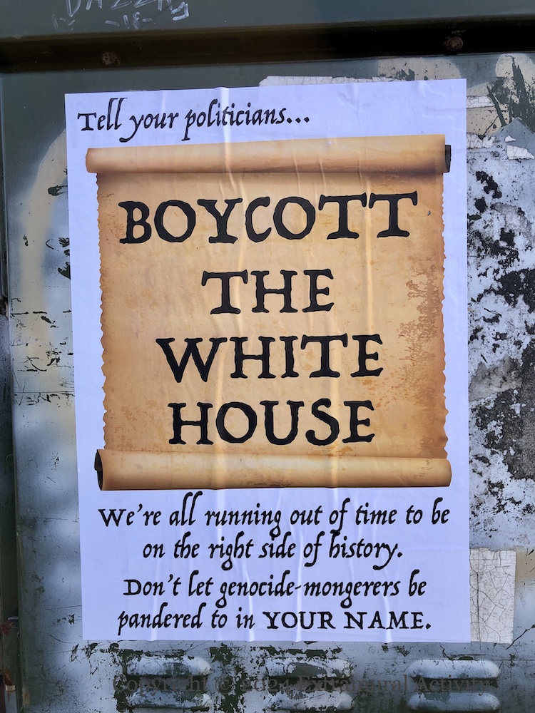“Tell local politicians… Boycott the White House or… we will never forgive you. We will never vote without recalling which politicians partied with the gleeful killers of thousands of Palestinians. We will never forget. We will never let you forget.”