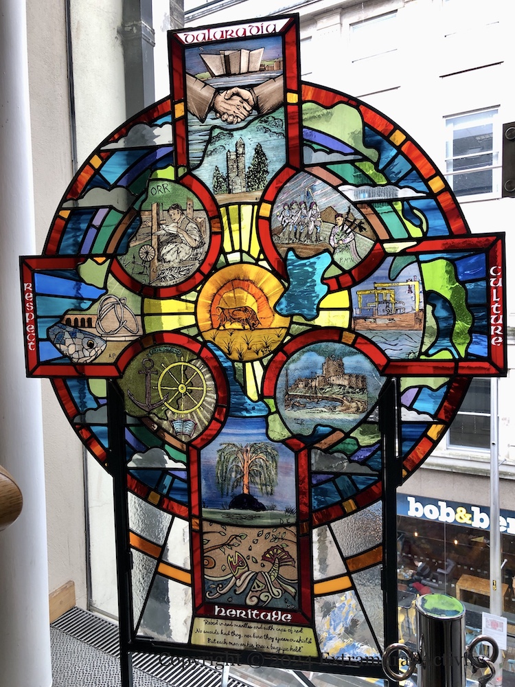 Words from Ferguson’s poem ‘Conary‘ (one of the Lays Of The Red Branch) are included at the base of the Dalaradia Window, a free-standing piece of stained glass in the Linen Hall Library (web): “Robed in red mantles and with caps of red/No swords had they, nor bore they spear or shield/But each man on his knee a bagpipe held.”