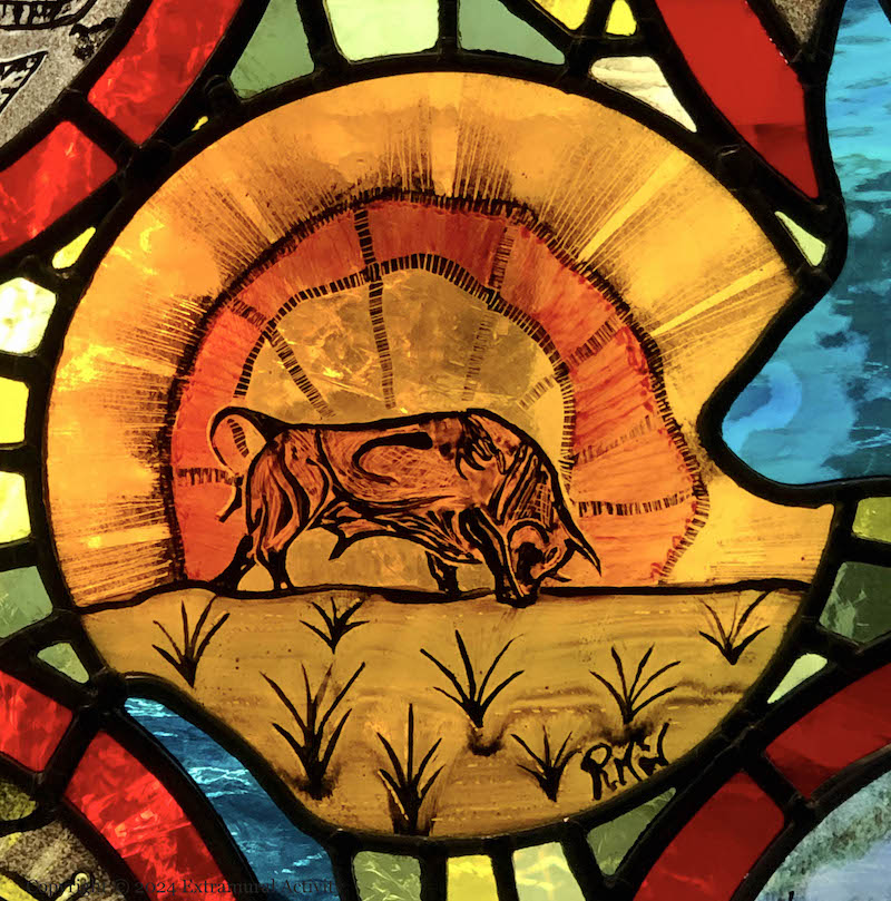 The image above shows the bó at the centre of the Táın, Donn Cúaılgne (the brown bull of Cooley), at the centre of Window, which is shown complete below; the other elements of the Window are detailed in this Dalaradia publication (pdf). A painted version of the Window can be seen in Kragfargus Cultural Corner.