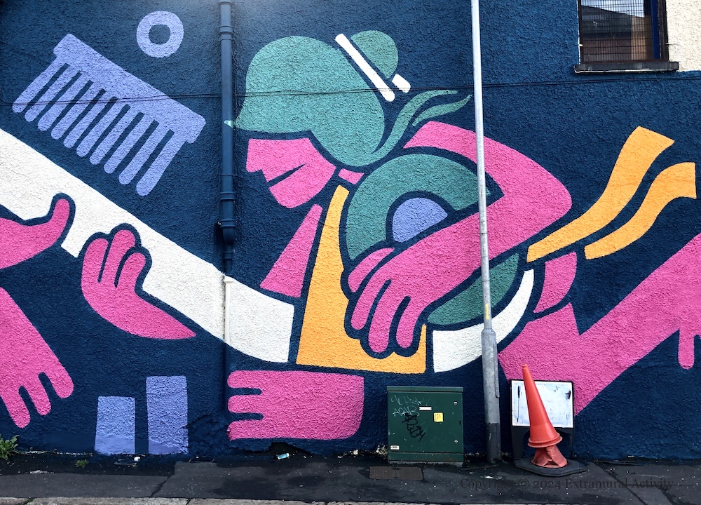 The inspiration for this new piece of street art by KMG (ig) was the Strand Spinning Mill (formerly the Jaffe Spinning Mill) which closed in 1983 and is now the Portview Trade Centre. During WWI the mill made munitions and during WWII viscose rayon. The film Lint And Linen (youtube) covers both pre-industrial and mechanical linen-production (though mostly focused on yarn from line fibres rather than from tow, which was the Strand mill’s claim to fame (Duffy Rafferty)); the painting appears to present a more primitive and imaginary age in which fibres could be spun using the human hand.