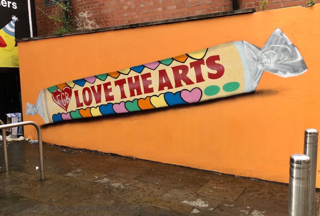 Love Hearts turn 70 years old in 2024 – they were originally included in crackers for the Christmas season in 1954. Over the years, the messages on them have changed, and various specialty versions have been produced, including for Prince William’s 21st (in 2003) and a recent collaboration with YoungMinds with affirmative messages (Swizzels | WP). The messages on these “Love tHeArts” – imagined by FGB (ig) in North Street, Belfast city centre – are perhaps less “Marry me” and “Be mine” and more “Fund me” and “Follow me on Instagram”.