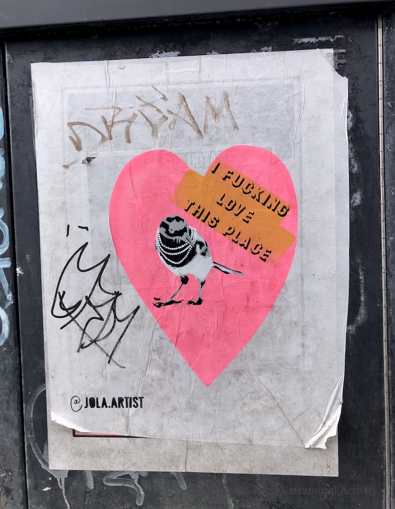 This is a poster by English artist JoLA (ig), who specialises in magpies. This one has pilfered a string of pearls. “I fucking love this place.”