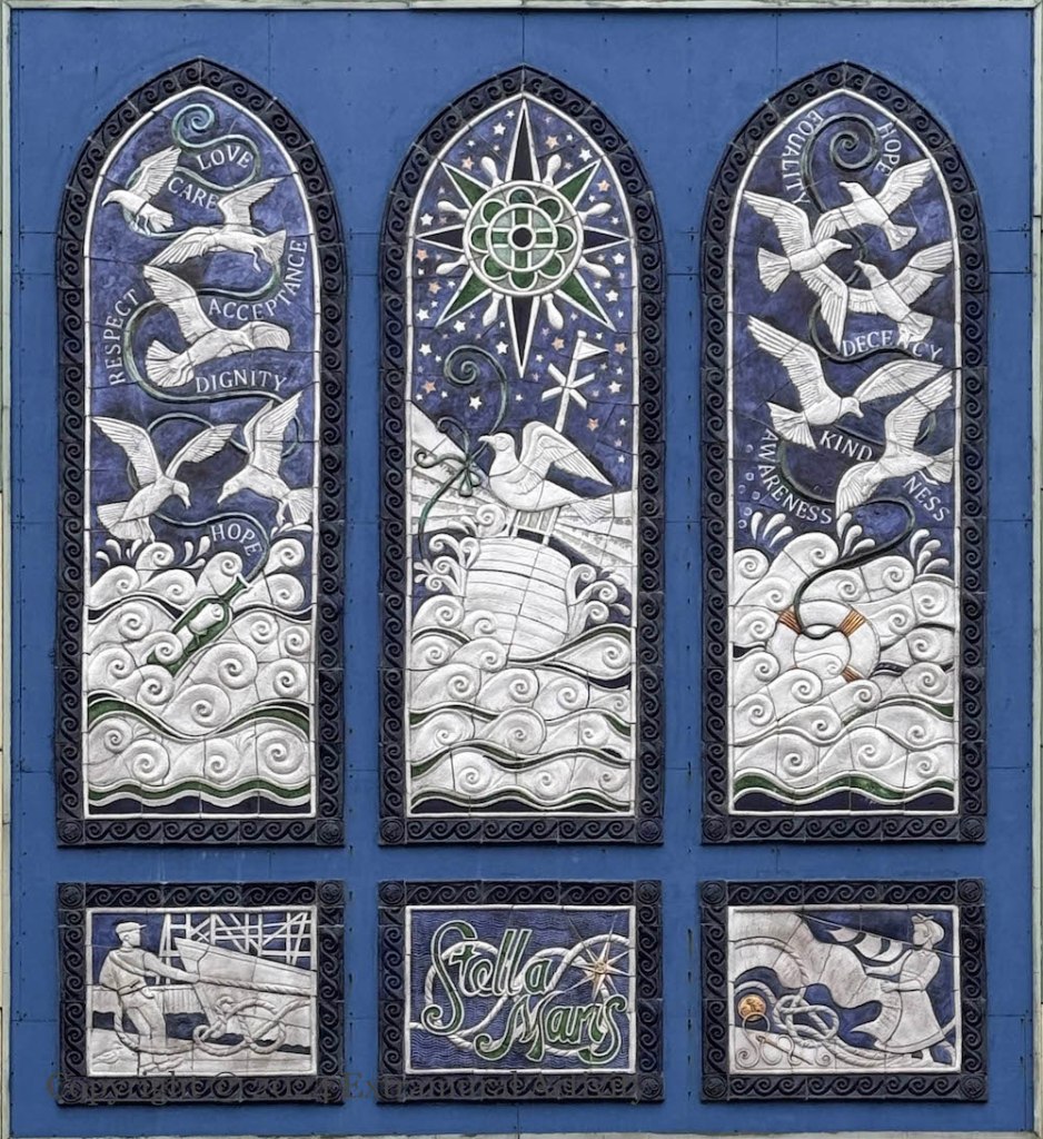 This large installation (by Elfire Ceramics – ig) on the exterior wall of the hostel is full of maritime imagery, including the pole star, as well images of hope such as a message in a bottle (left) and a life-preserver (right), as well as inspirational words: love, care, acceptance, respect, dignity, hope, equality, decency, kindness, awareness.