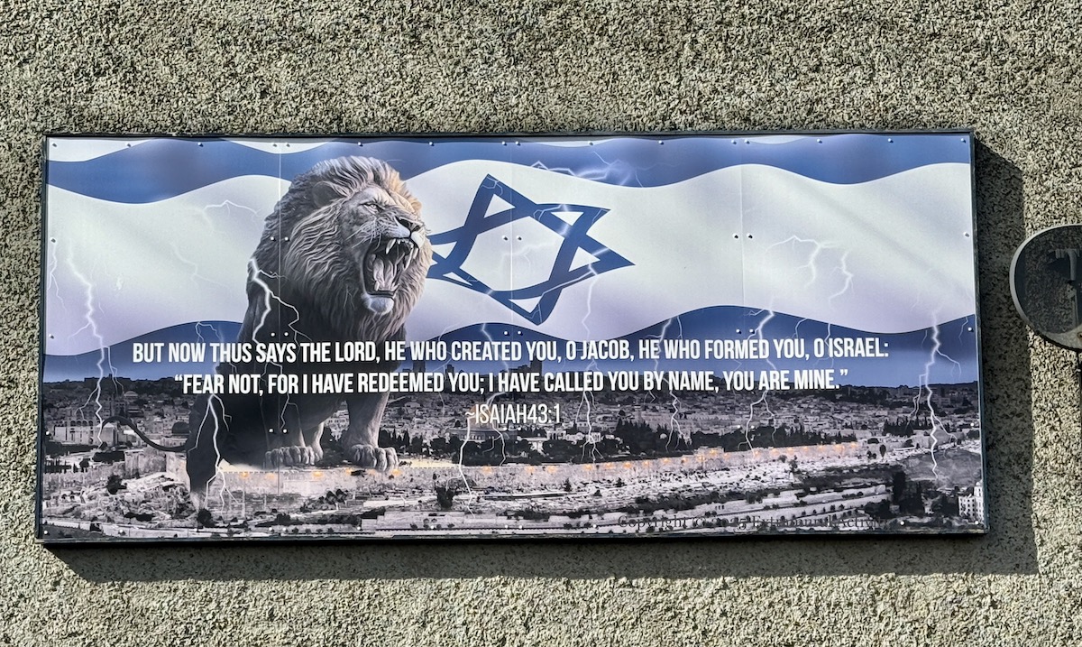 If the Rehoboth board is counted as religious rather than political, the most sophisticated graphical expression of PUL support for Israel is the small paste-up seen in Ulster Supports The People Of Israel. (There is also implicit support for Israel in the board in Peter’s Hill to John Henry Patterson, which includes amongst his other exploits – including Operation Lion – his role as Godfather Of The Israeli Army.)