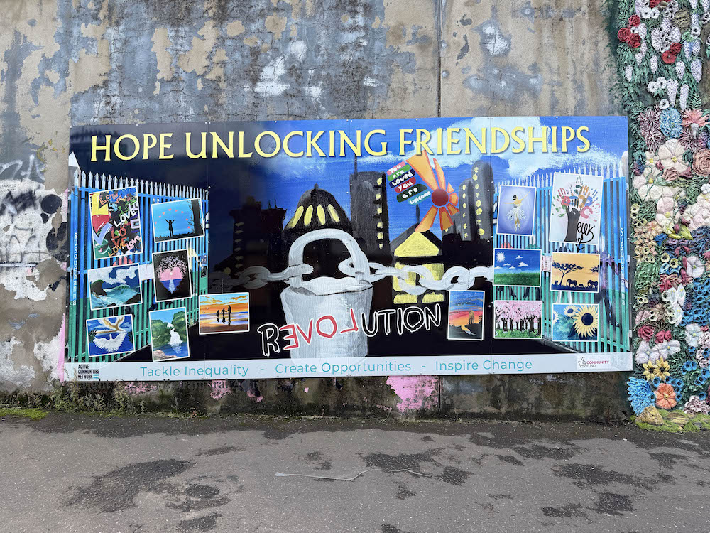 “Tackle inequality – create opportunities – inspire change”. The large board shown here is in Cupar Way, near the security gates in North Howard Street, which are locked nightly between 8:30 and 6:30 a.m. (DoJ). These and the nearby Northumberland Street gates separate the lower Falls and the middle Shankill, including the young people from the Active Communities Network (web), a cross-community youth group that lobbied for increased opening hours to allow members to return home quickly after meetings (BBC).