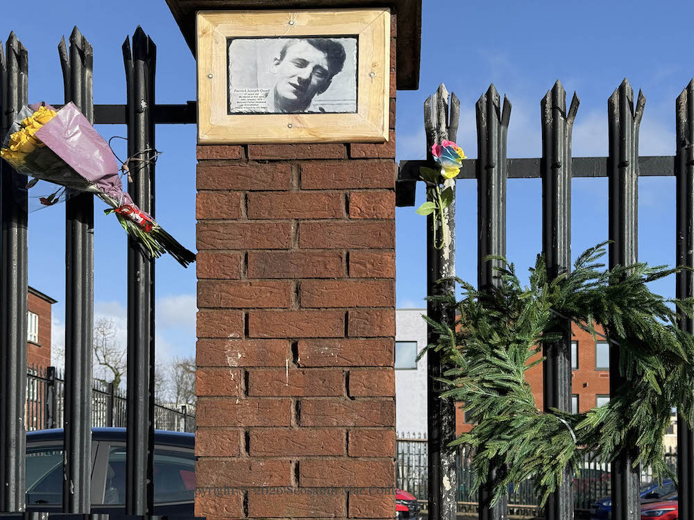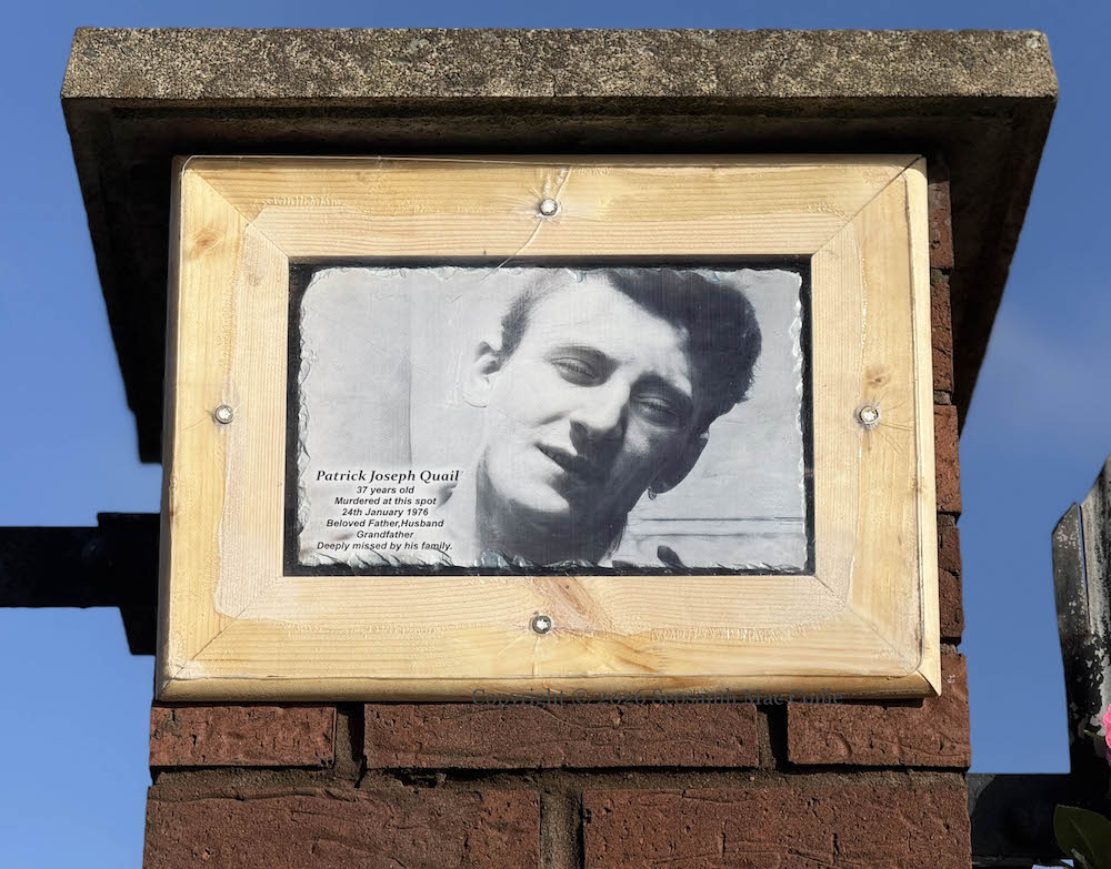 “Patrick Joseph Quail, 37 years old, murdered at this spot 24th January 1976, beloved father, husband, grandfather. Deeply missed by his family.” A plaque to Patrick Quail was unveiled at the end of January, on the fiftieth anniversary of his death. Quail was shot while walking along Clifton Street, between Henry Place and (what was at the time) Glenravel Street. Soldiers from the Argyll And Sutherland Highlanders are suspected in the execution (RN | Relatives For Justice pdf).