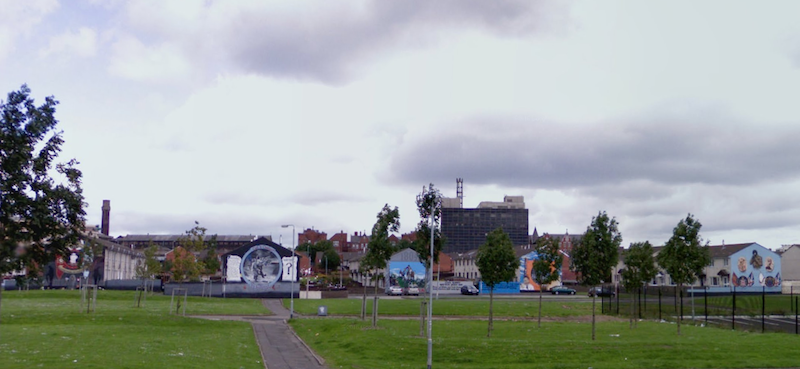 Gable-end (or simply “gable”) walls are preferred because of their large size and the absence of windows. Houses here are traditionally side-gabled (rather than front-gabled) and so most gable walls are at right angles to the street, but at any junction at least one of the gables will be visible. Here is an image of the the north side of the green in the lower Shankill estate in 2008. Five gables are visible from left to right (two more are off-camera to the right) where rows of houses end at road at the top of the green in the centre of the estate.