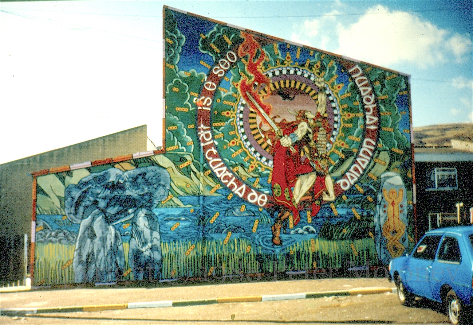 It is unlikely that Rí Nuadha was intended to be outward-facing, as people not from the immediate area would have little cause to enter Springhill. Police and soldiers did enter the area on patrol and some of them had their picture taken in front of it, apparently acknowledging its power. (It was occasionally paint-bombed by British forces and its great detail and many colours made it difficult to repair – there would not be many murals of this level of detail until after the ceasefire and there would be many during the Troubles which were pointedly simple in their choice of colour and design – as a stark example, see Mandela, Father Of Freedom M00529 which Mo Chara painted the following year, 1988.)