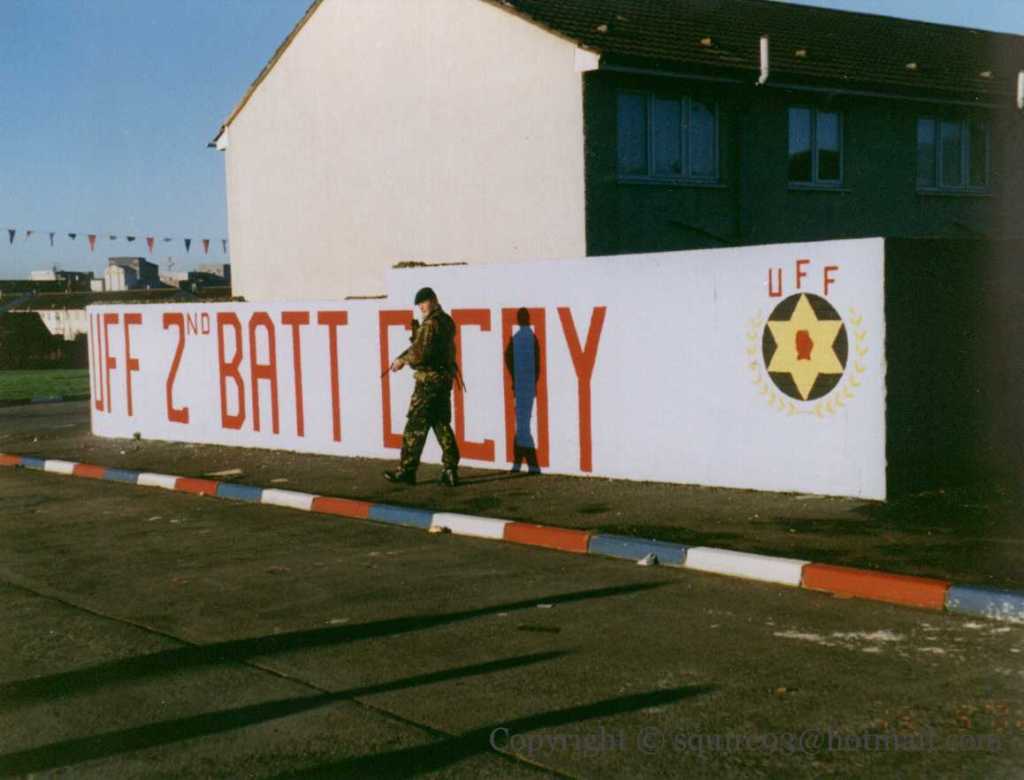 A more traditional Queen Elizabeth II ‘golden jubilee’ mural replaced the ‘UFF A C B Coy’ in 2002 (see J1251). A and B companies did not join Adair in the feud with the UVF.