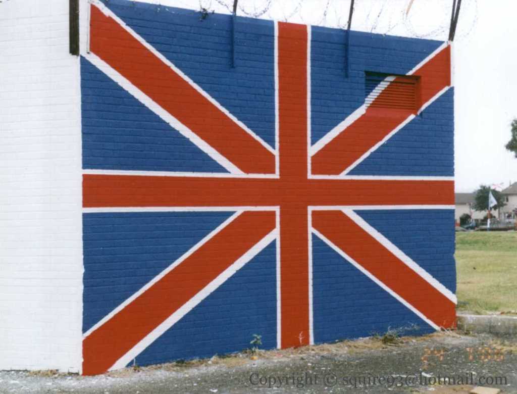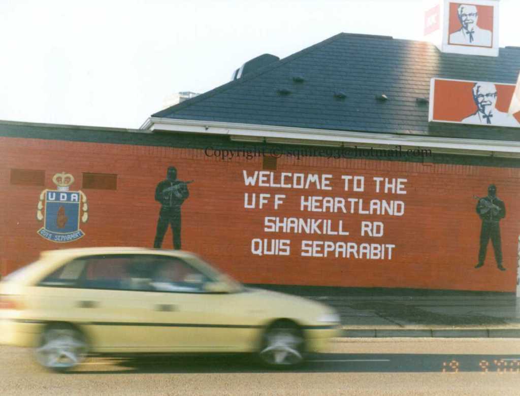 The following used only words and symbols. A large electrical box/sub-station on the Shankill Road side of the estate was painted on two sides: