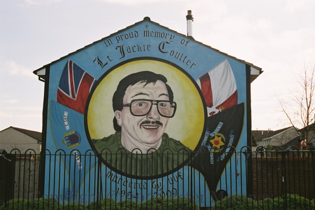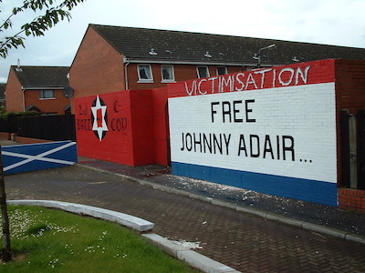 Adair’s ambitions brought him into conflict with the UVF, whom he tried to drive out of the lower Shankill (and Highfield). At least seven died in the feud, including the UDA’s Jackie Coulter (see below) and the UVF’s Sam Rockett (X07011). (Various of Adair’s gang relocated to Glenbryn and were a cause of the Holy Cross dispute in 2001 and 2002 (BelTel).) Adair was returned to prison in August, 2000. While imprisoned, several “Free J Adair” murals appeared (in various parts of Belfast and in the LVF’s strongholds in Lurgan) and some more new murals. He remained in prison until May 2002.