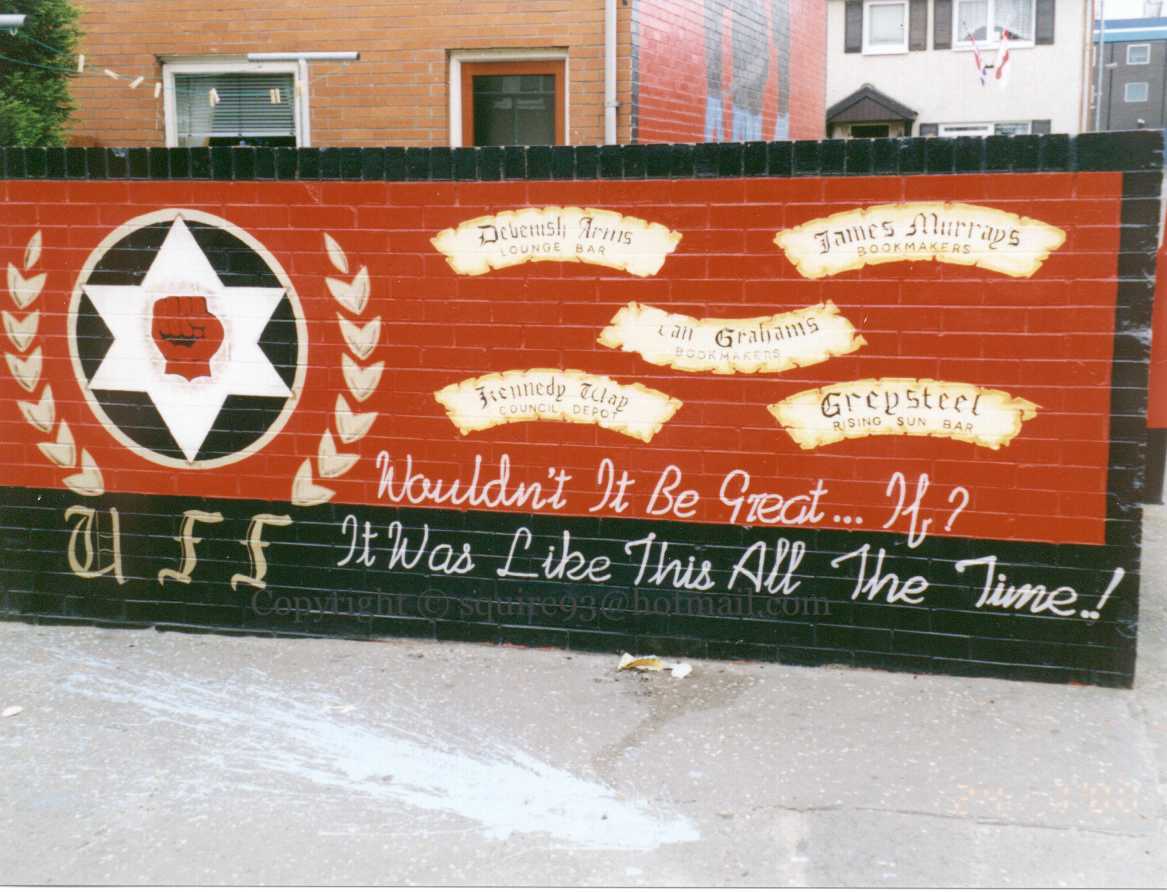 As might be expected given the circumstances – the tensions between the UDA and UVF, the tensions between the UDA brigades, the recent signing of and referendum on the Agreement, the pressures to decommission – many showed the symbols and the potential for violence of the UDA (a.k.a. UFF/Ulster Freedom Fighters, with UYM/Ulster Young Militants as a youth wing):